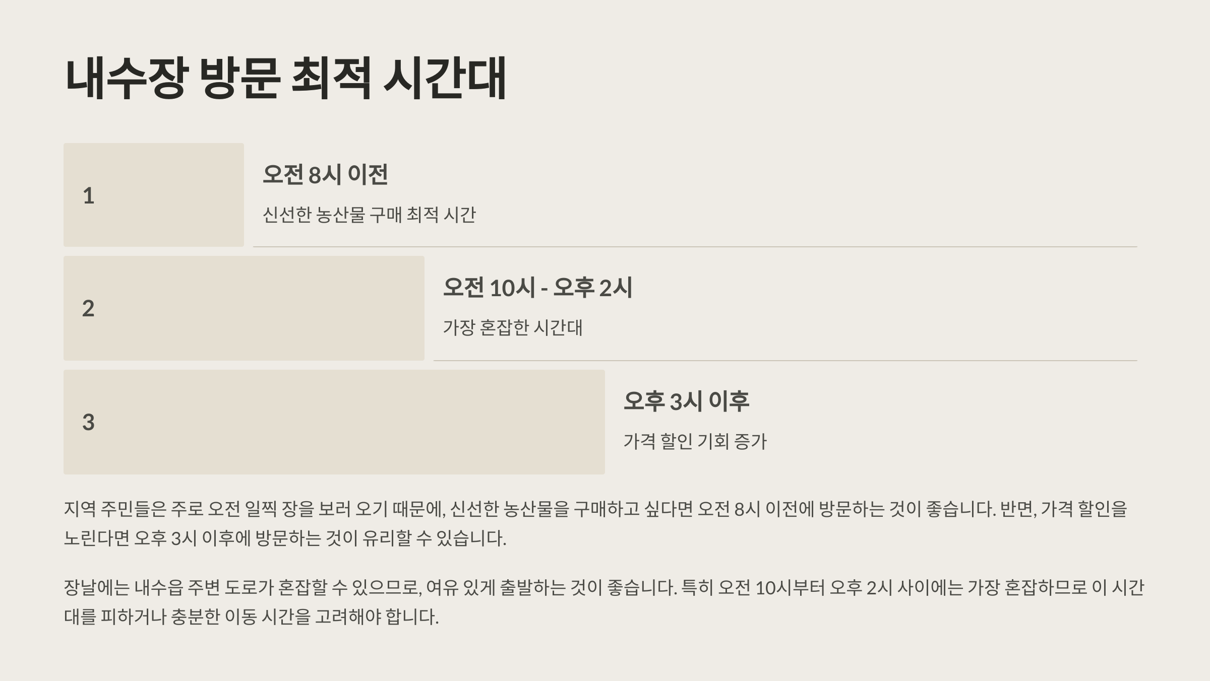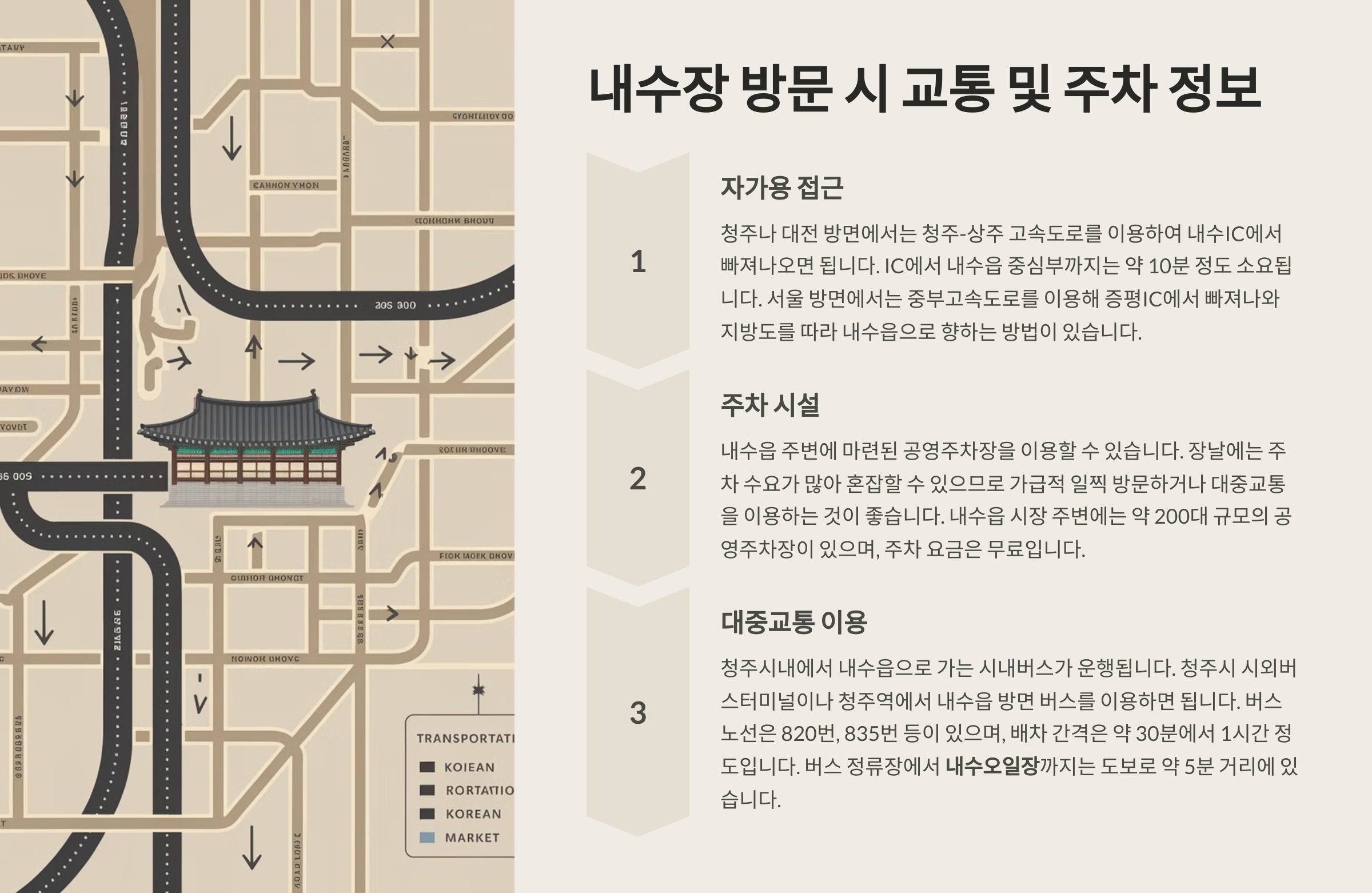 장날에는 내수읍 주변 도로가 혼잡할 수 있으므로, 여유 있게 출발하는 것이 좋습니다. 특히 오전 10시부터 오후 2시 사이에는 가장 혼잡하므로 이 시간대를 피하거나 충분한 이동 시간을 고려해야 합니다.