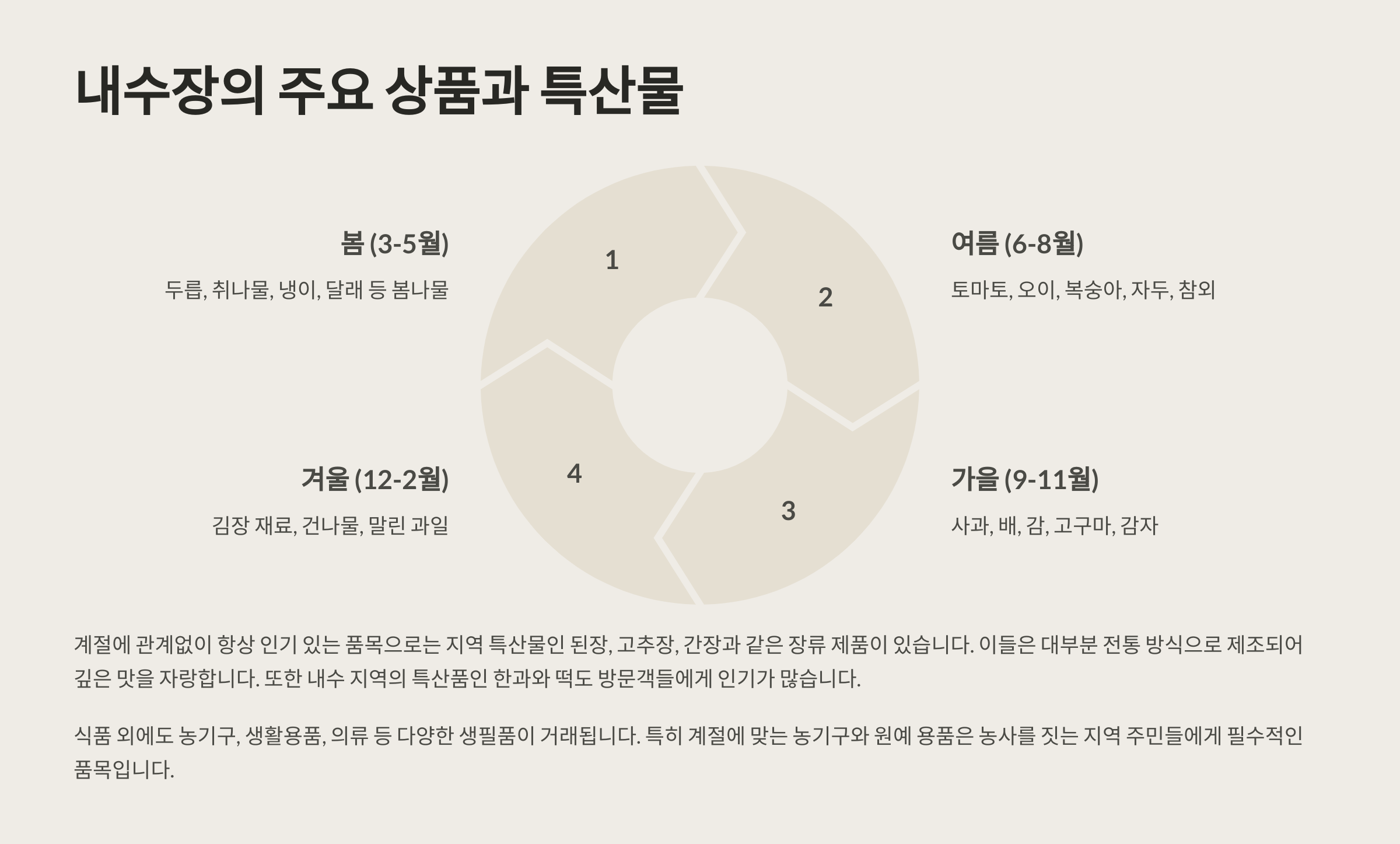 - 내수장날에는 지역 특산 농산물이 계절별로 다양하게 판매됨