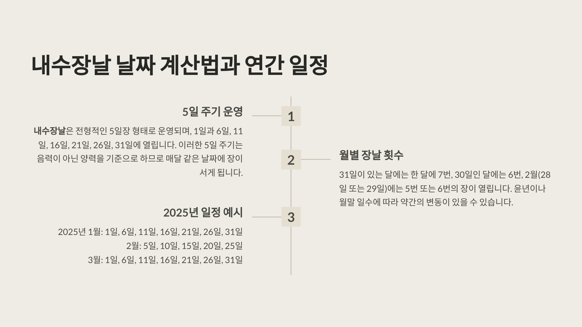 내수장날은 전형적인 5일장 형태로 운영되며, 1일과 6일, 11일, 16일, 21일, 26일, 31일에 열립니다. 이러한 5일 주기는 음력이 아닌 양력을 기준으로 하므로 매달 같은 날짜에 장이 서게 됩니다.