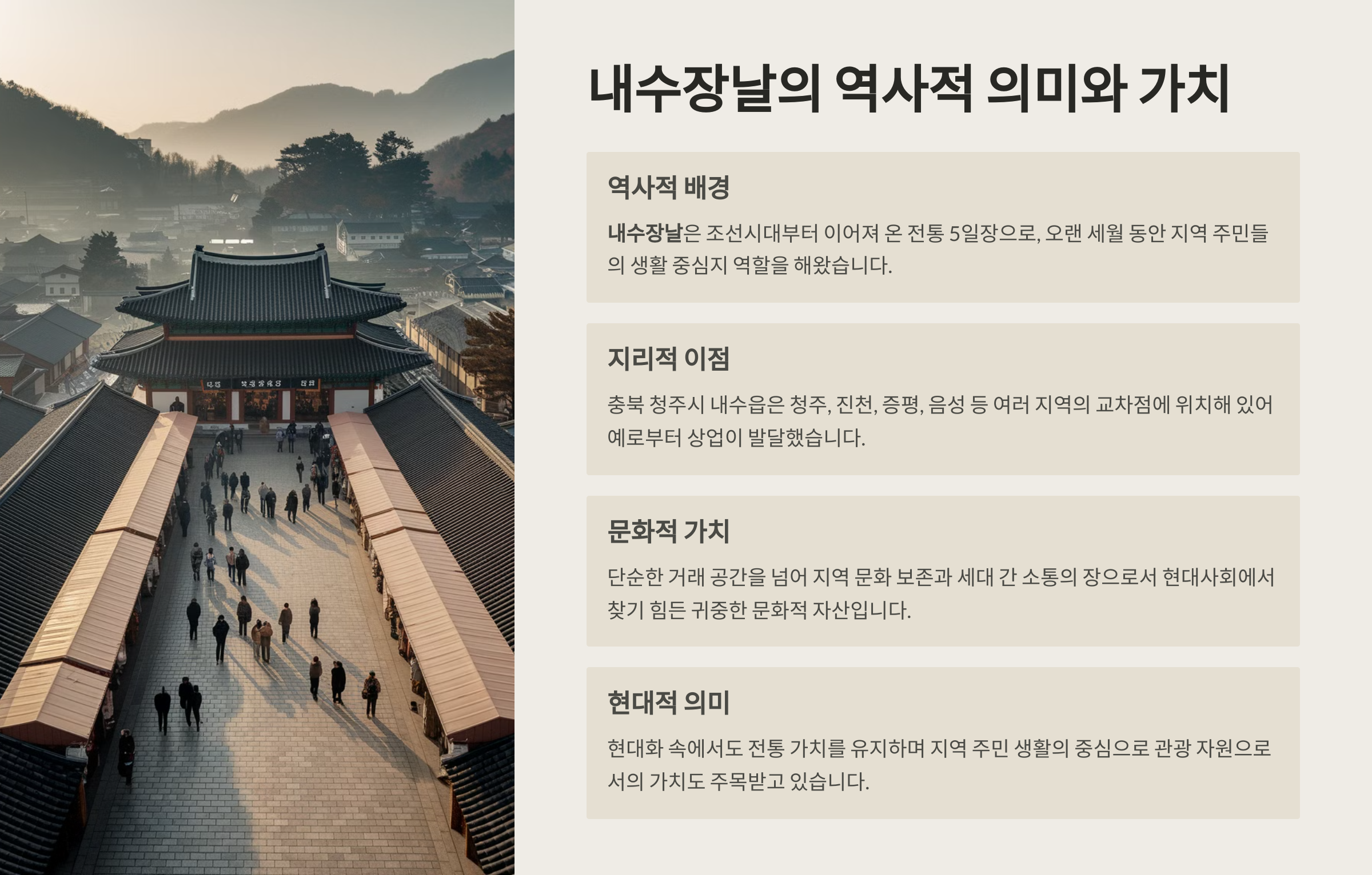 충북 청주시 내수읍에서 열리는 내수장날은 조선시대부터 이어져 온 전통 시장입니다. 과거 농경사회에서 5일마다 열리는 장터는 물건을 사고파는 것 이상의 의미를 가졌습니다. 농민들은 자신들이 생산한 농산물을 판매하고, 필요한 생필품을 구입했으며, 이웃 마을 사람들과 소식을 나누는 소통의 장이었습니다.
