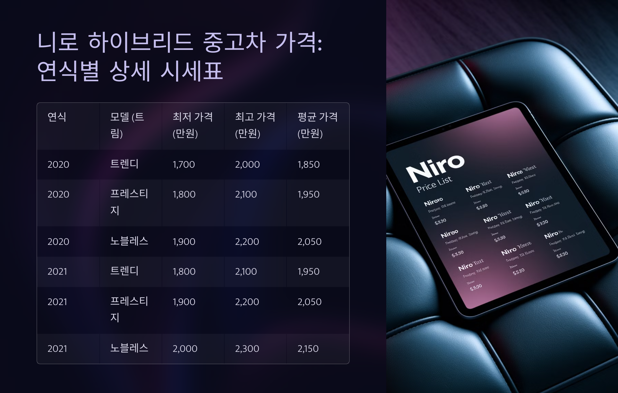 친환경성과 경제성을 겸비한 니로 하이브리드는 중고차 시장에서도 꾸준한 인기를 얻고 있습니다. 합리적인 가격으로 니로 하이브리드를 구매하고자 하는 소비자들을 위해, 이 글에서는 니로 하이브리드 중고차 가격 시세 정보와 구매 시 고려해야 할 사항들을 상세하게 분석하여 제공합니다. 연식별, 모델별 니로 하이브리드 중고 시세를 꼼꼼히 비교하고, 최적의 니로 하이브리드 중고 가격으로 차량을 구매할 수 있도록 도와드리겠습니다. 지금부터 니로 하이브리드 중고차 구매 여정을 시작해볼까요?