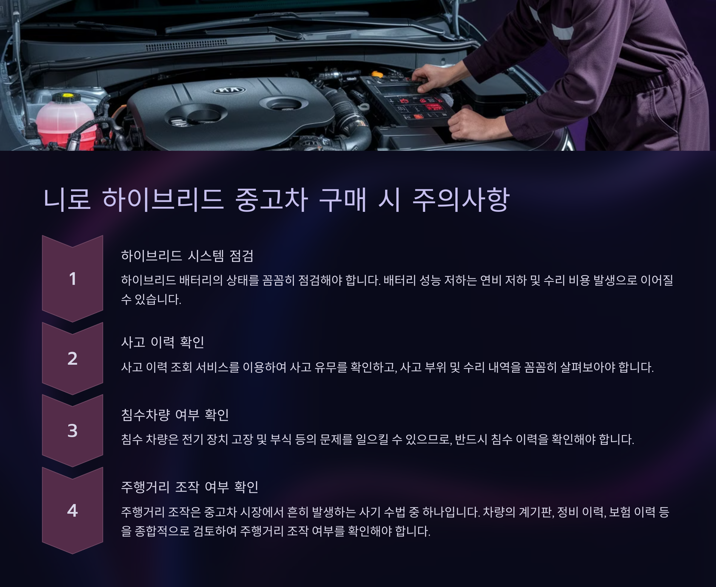 니로 하이브리드 중고차를 구매할 때는 다음과 같은 사항에 주의해야 합니다.