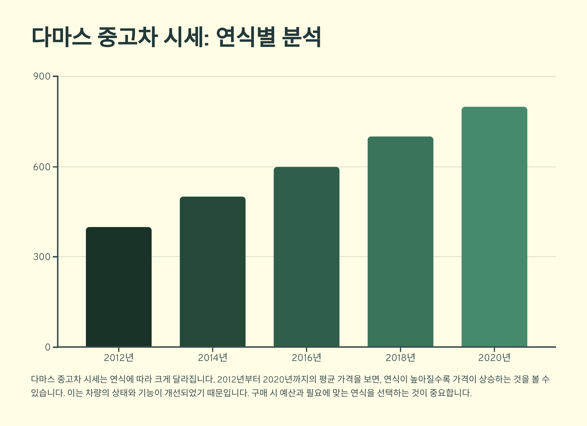 다마스 중고 가격은 연식, 모델, 주행거리, 사고 유무 등에 따라 크게 달라집니다. 최근 10년간의 다마스 중고차 시세를 분석하여 정확한 정보를 제공합니다.