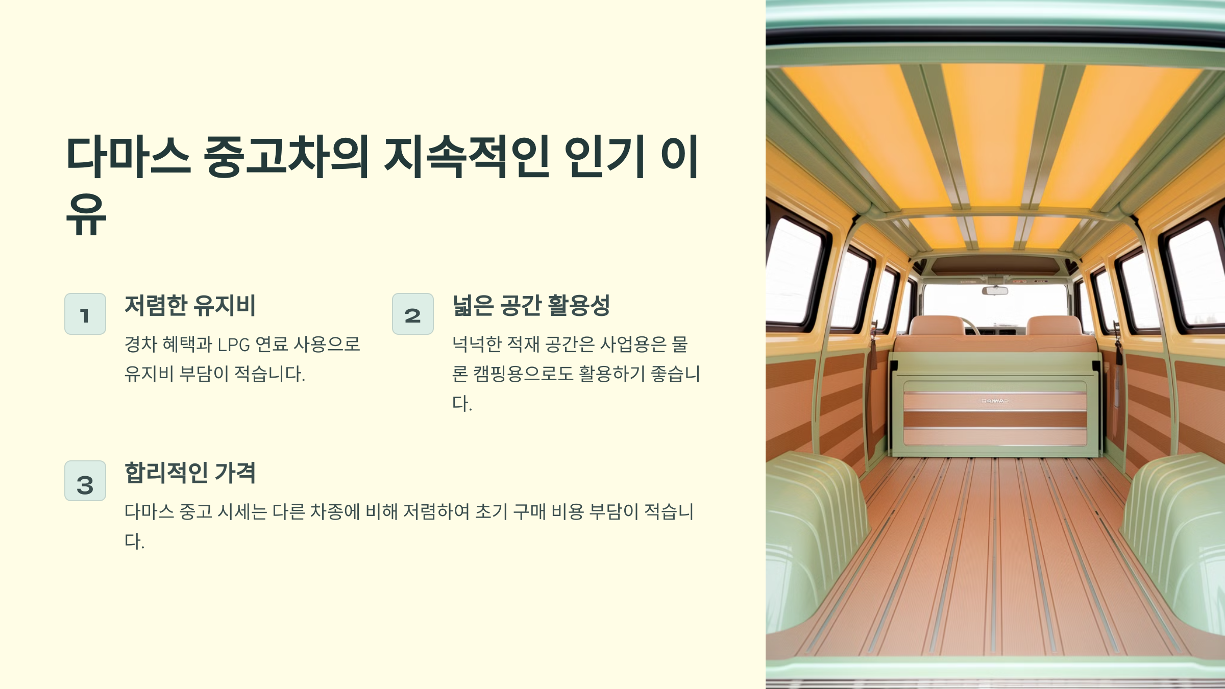 - 합리적인 가격: 다마스 중고 시세는 다른 차종에 비해 저렴하여 초기 구매 비용 부담이 적습니다.