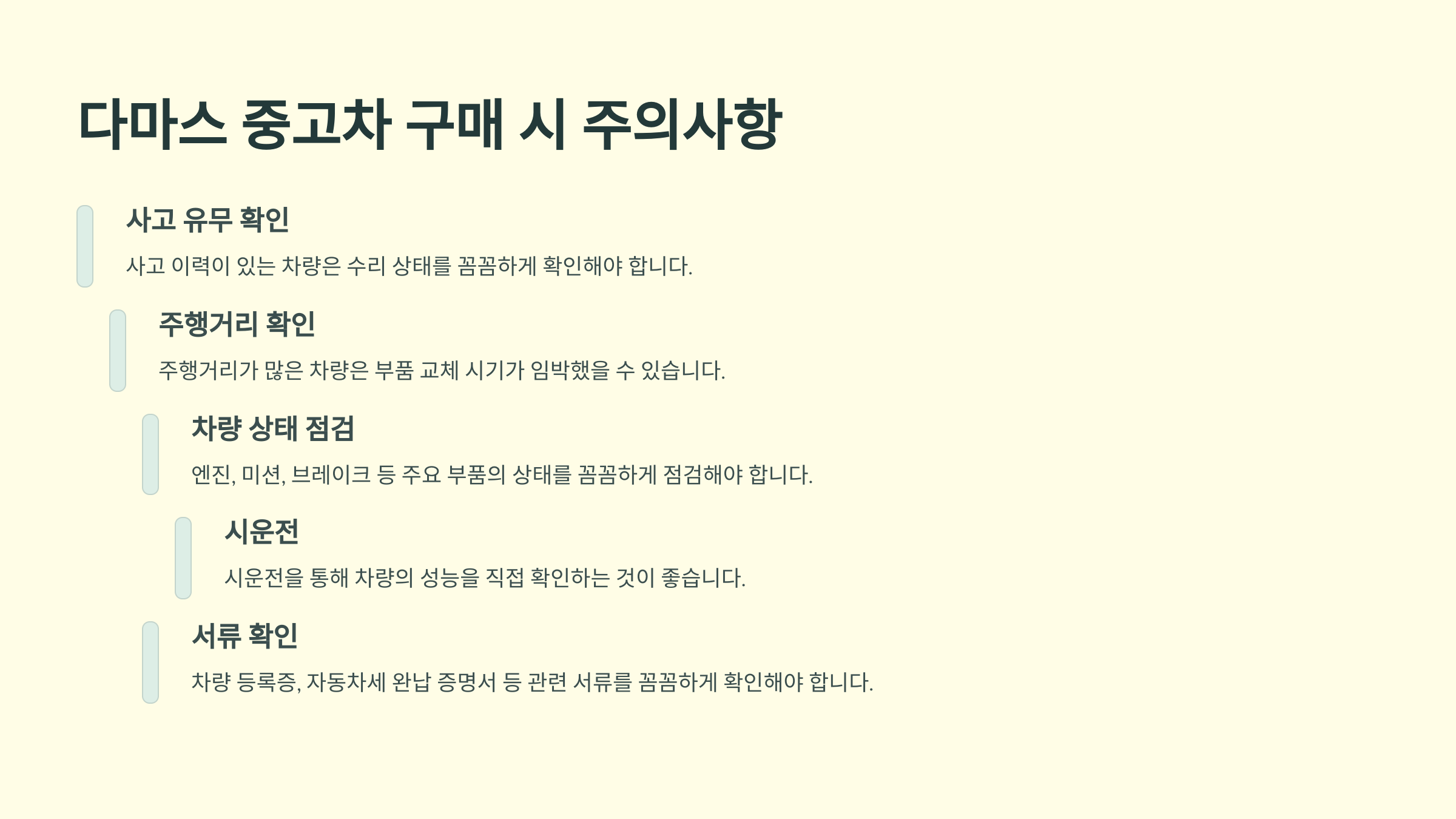다마스 중고차 구매 시에는 다음과 같은 사항에 주의해야 합니다.
