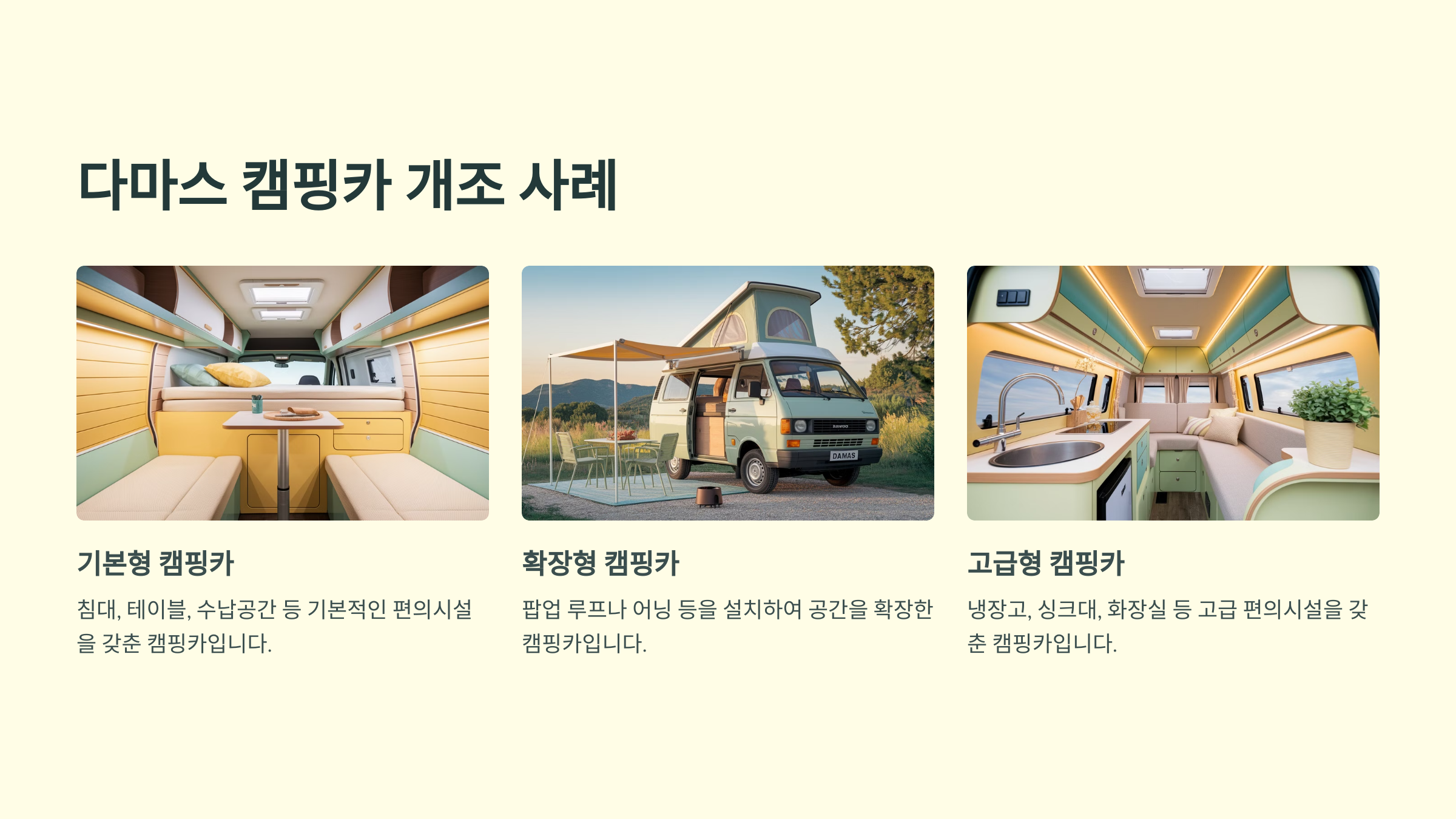 다마스 캠핑카는 다양한 형태로 개조될 수 있습니다. 몇 가지 인기 있는 개조 사례는 다음과 같습니다.