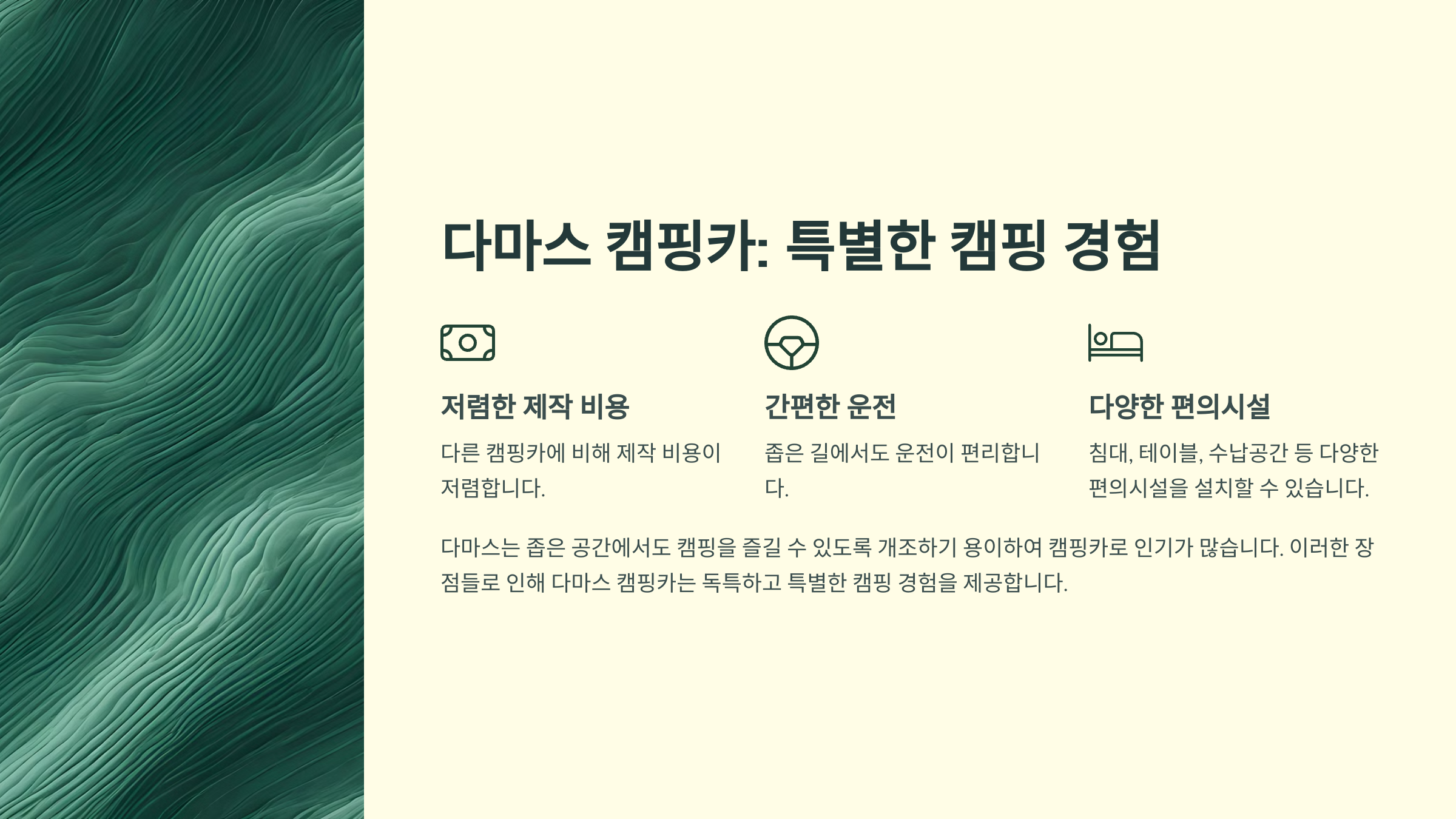 다마스는 좁은 공간에서도 캠핑을 즐길 수 있도록 개조하기 용이하여 캠핑카로 인기가 많습니다. 다마스 캠핑카는 다음과 같은 장점이 있습니다.