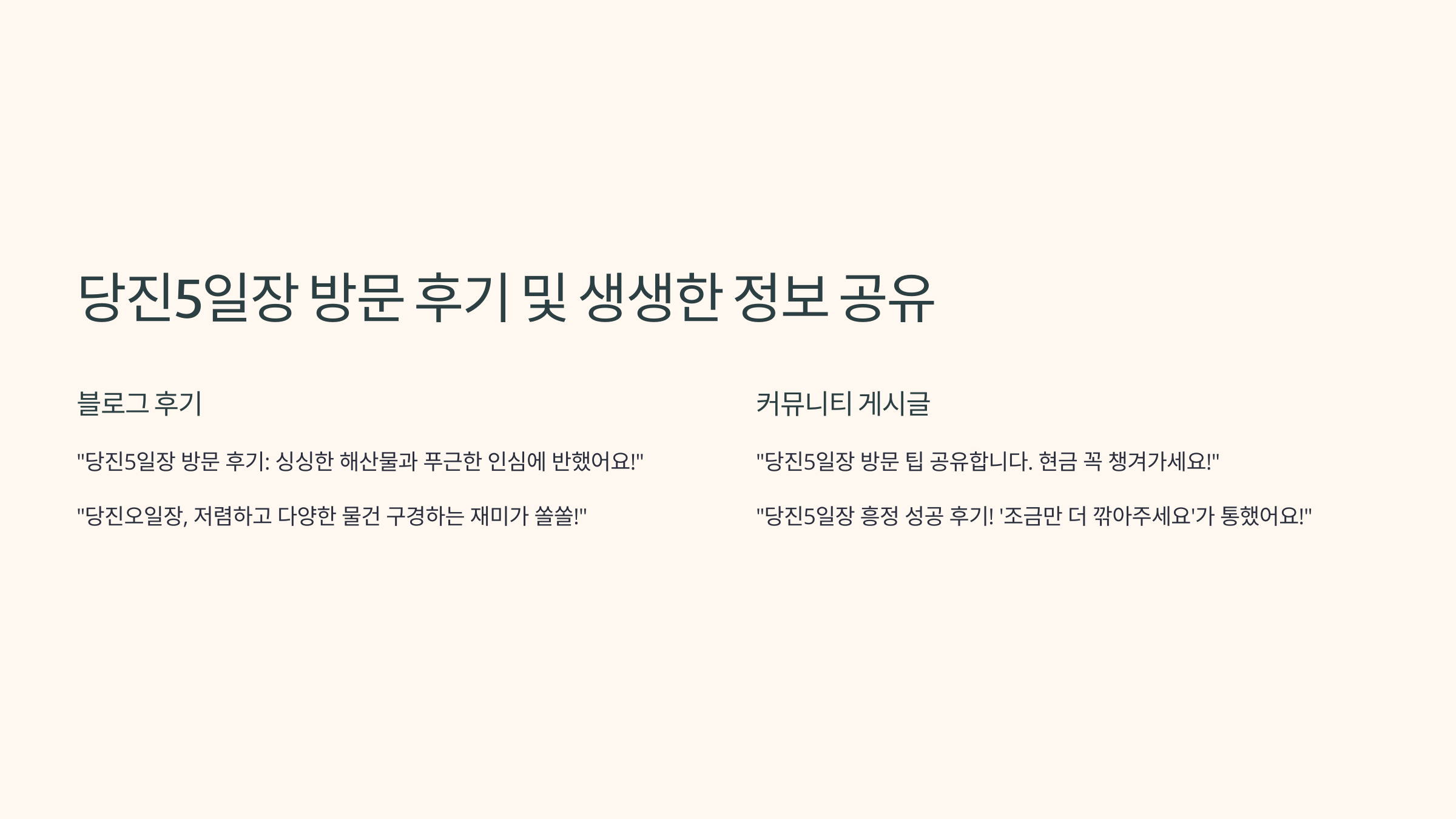 실제로 당진5일장을 방문한 사람들의 후기를 통해 생생한 정보를 얻어 보세요. 방문 시 주의사항, 추천 먹거리, 흥정 팁 등 유용한 정보를 공유합니다.