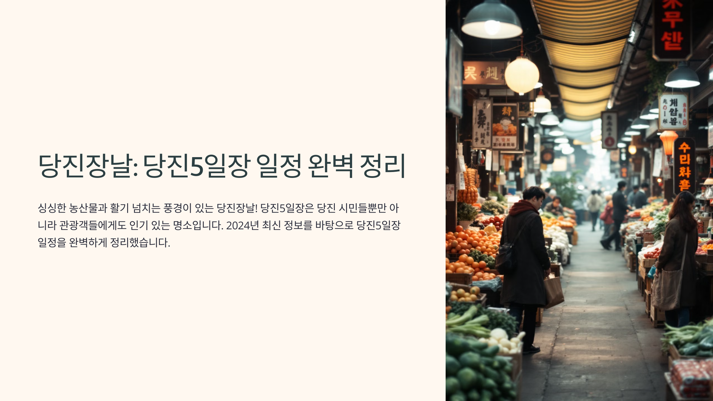 싱싱한 농산물과 활기 넘치는 풍경이 있는 당진장날! 당진5일장은 당진 시민들뿐만 아니라 관광객들에게도 인기 있는 명소입니다. 하지만 정확한 날짜를 몰라 헛걸음하는 경우가 종종 발생합니다. 그래서 준비했습니다. 2024년 최신 정보를 바탕으로 당진5일장 일정을 완벽하게 정리했습니다. 이제 더 이상 헛걸음하지 마시고, 풍성한 당진장날의 매력을 만끽하세요!