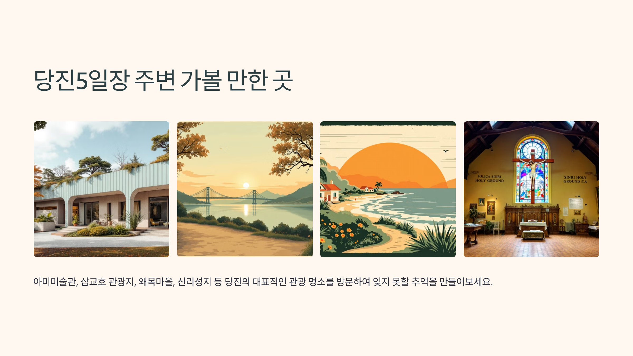 당진5일장 방문을 더욱 풍성하게 만들어줄 주변 가볼 만한 곳을 소개합니다. 아미미술관, 삽교호 관광지, 왜목마을 등 당진의 대표적인 관광 명소를 방문하여 잊지 못할 추억을 만들어보세요.