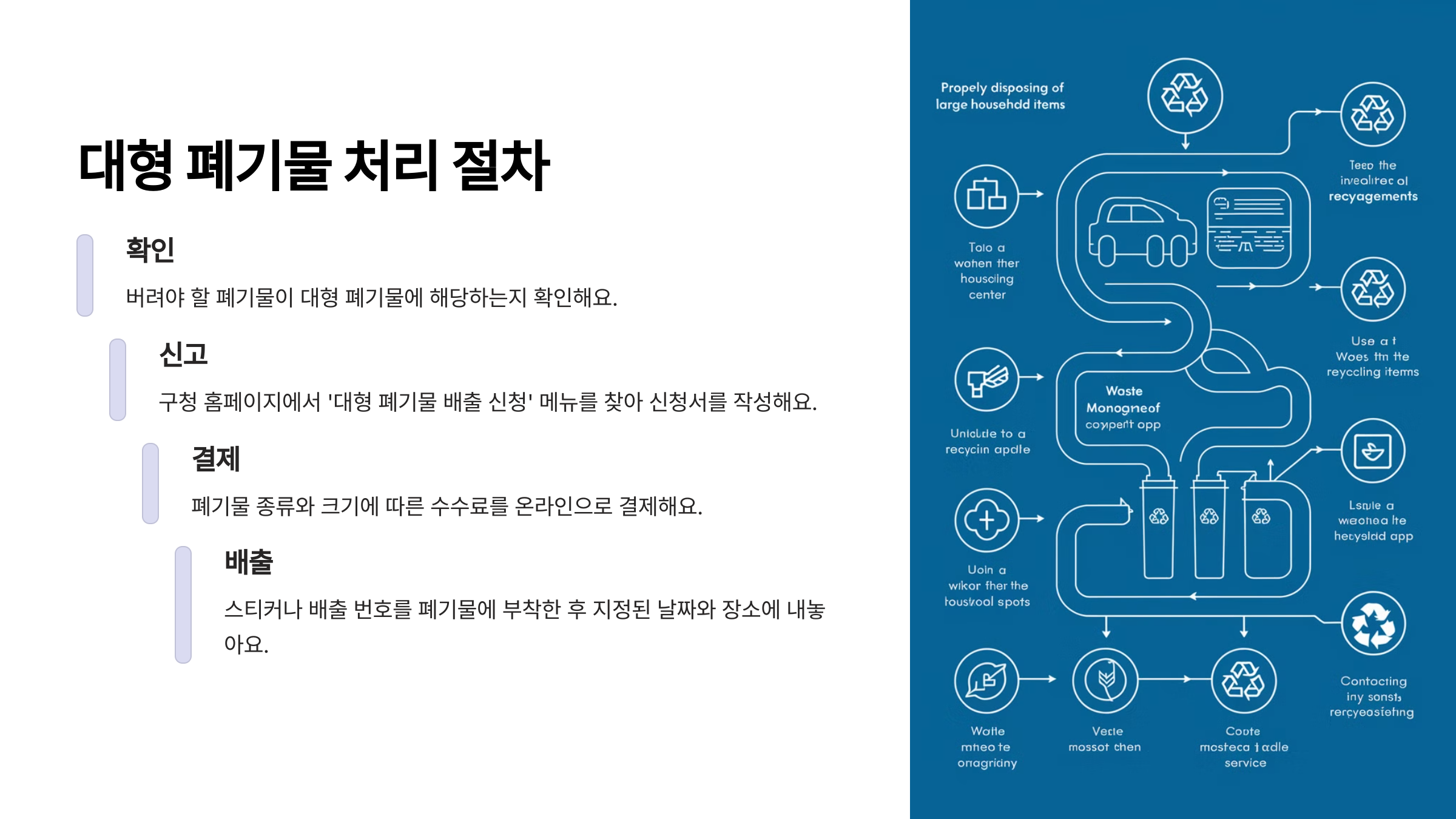 가장 먼저, 대형 폐기물은 함부로 버리면 안 된다는 점! 꼭 기억해야 해요. 폐기물관리법에 따라 무단 투기는 엄연한 불법이고, 최대 100만 원 이하의 과태료가 부과될 수 있거든요. 그러니 귀찮더라도 정해진 절차를 꼭 지켜주세요.