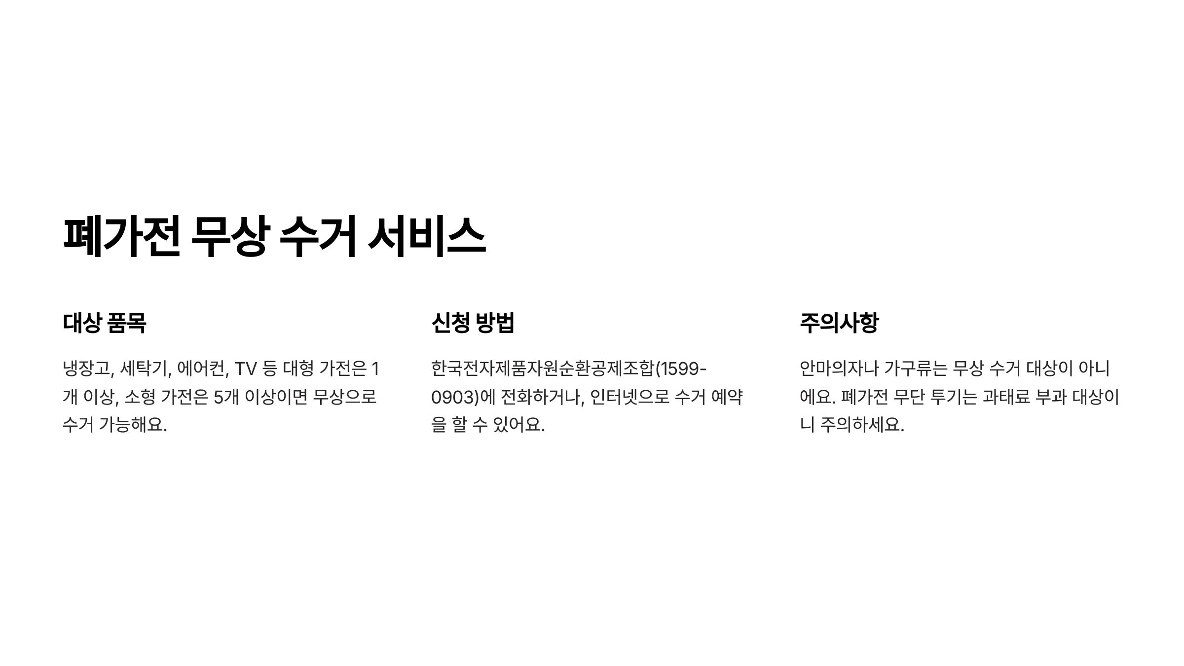 | 대형 가전 (냉장고, 세탁기, 에어컨, TV) | 1개 이상 | 한국전자제품자원순환공제조합 (1599-0903) 전화 또는 인터넷 예약, 지역별 대형가전 무료수거 서비스 활용 |