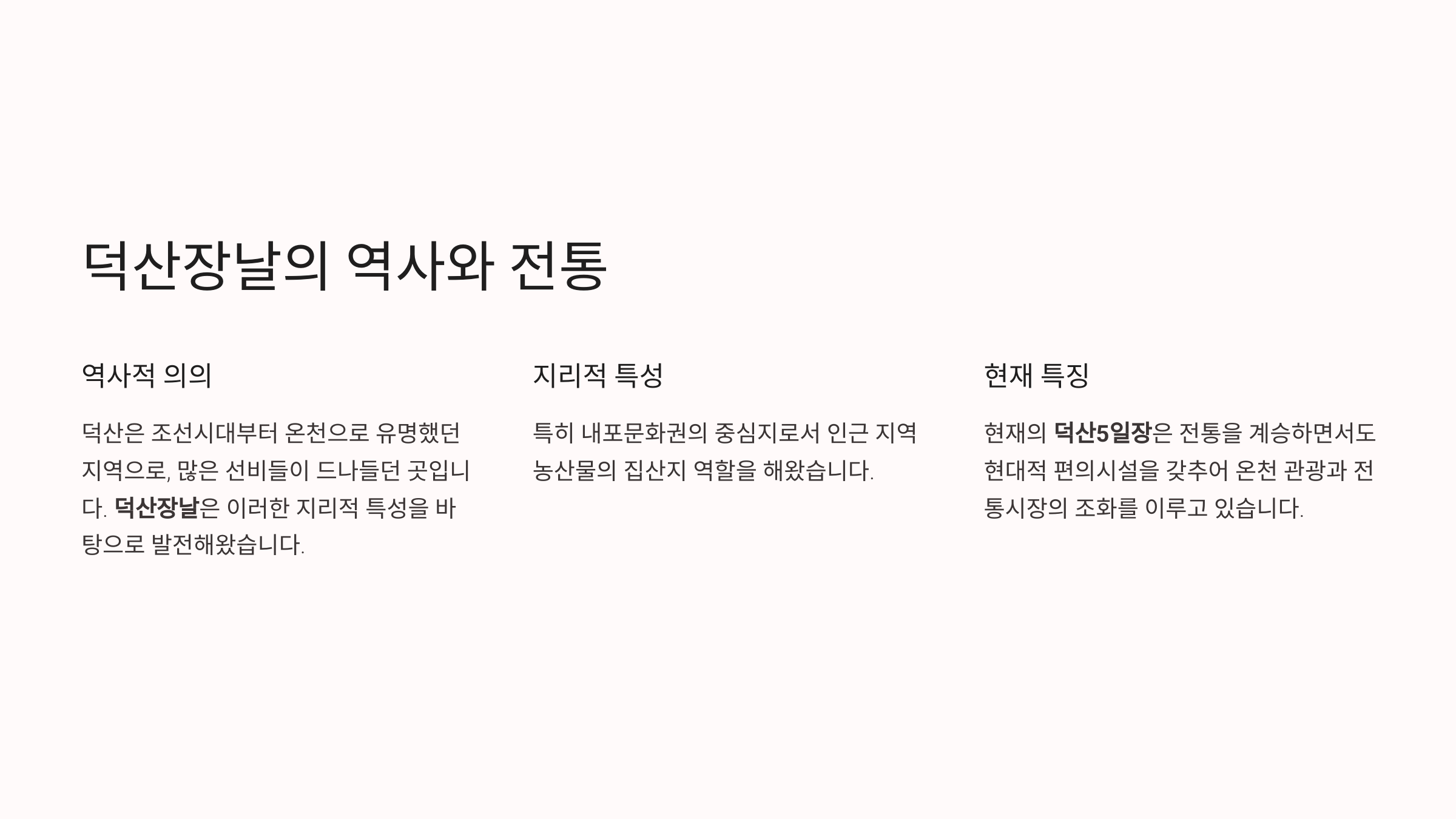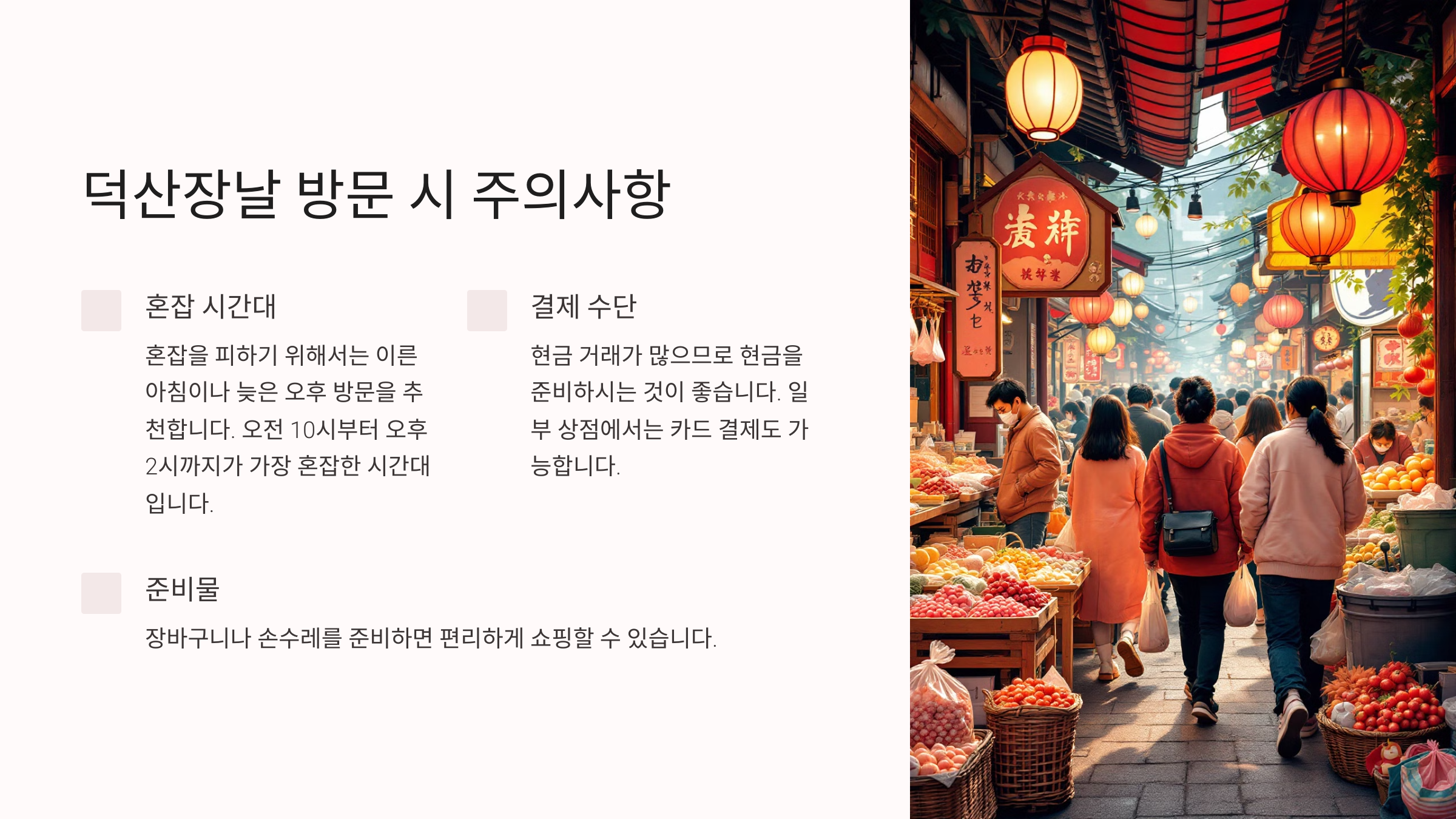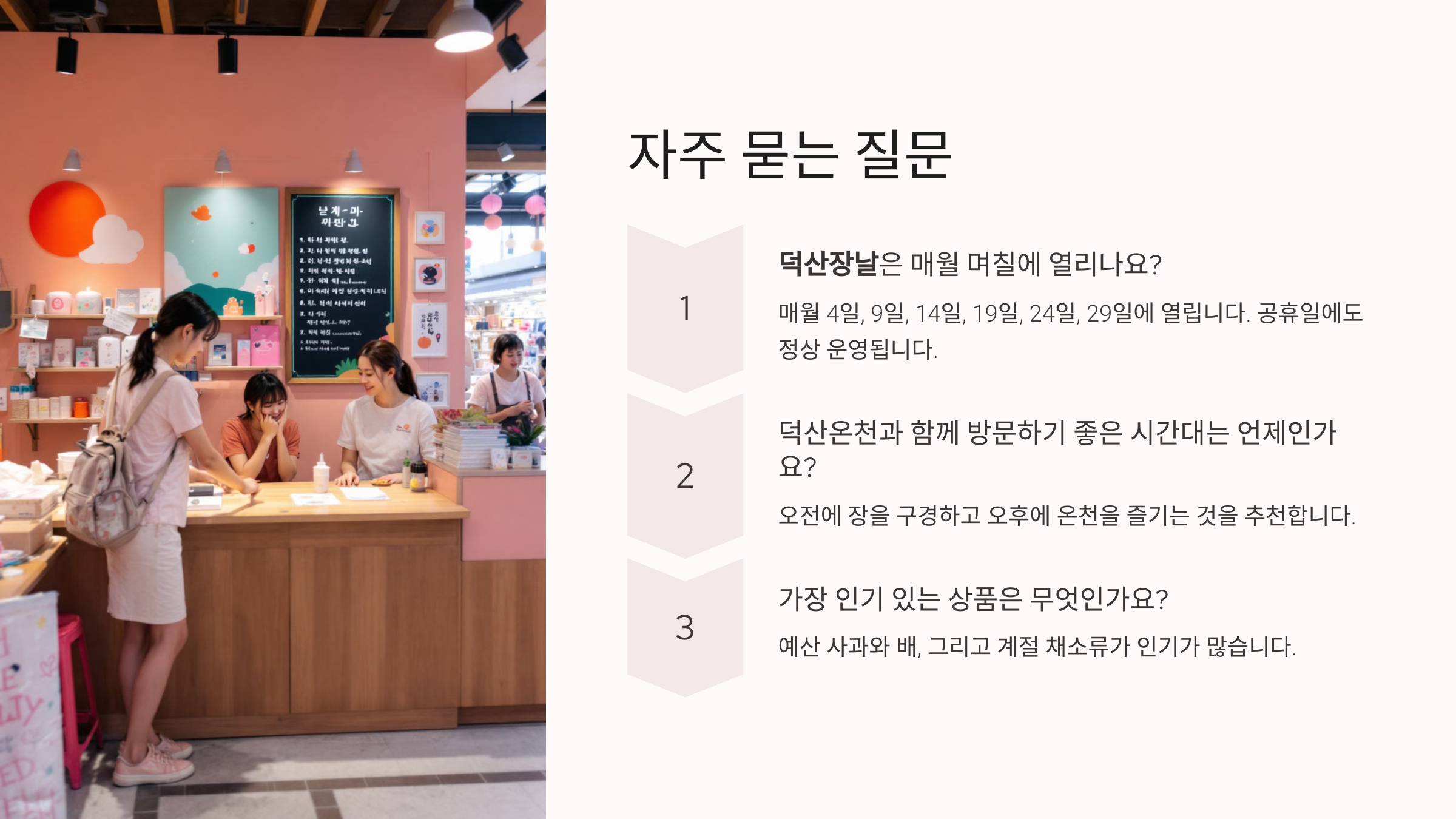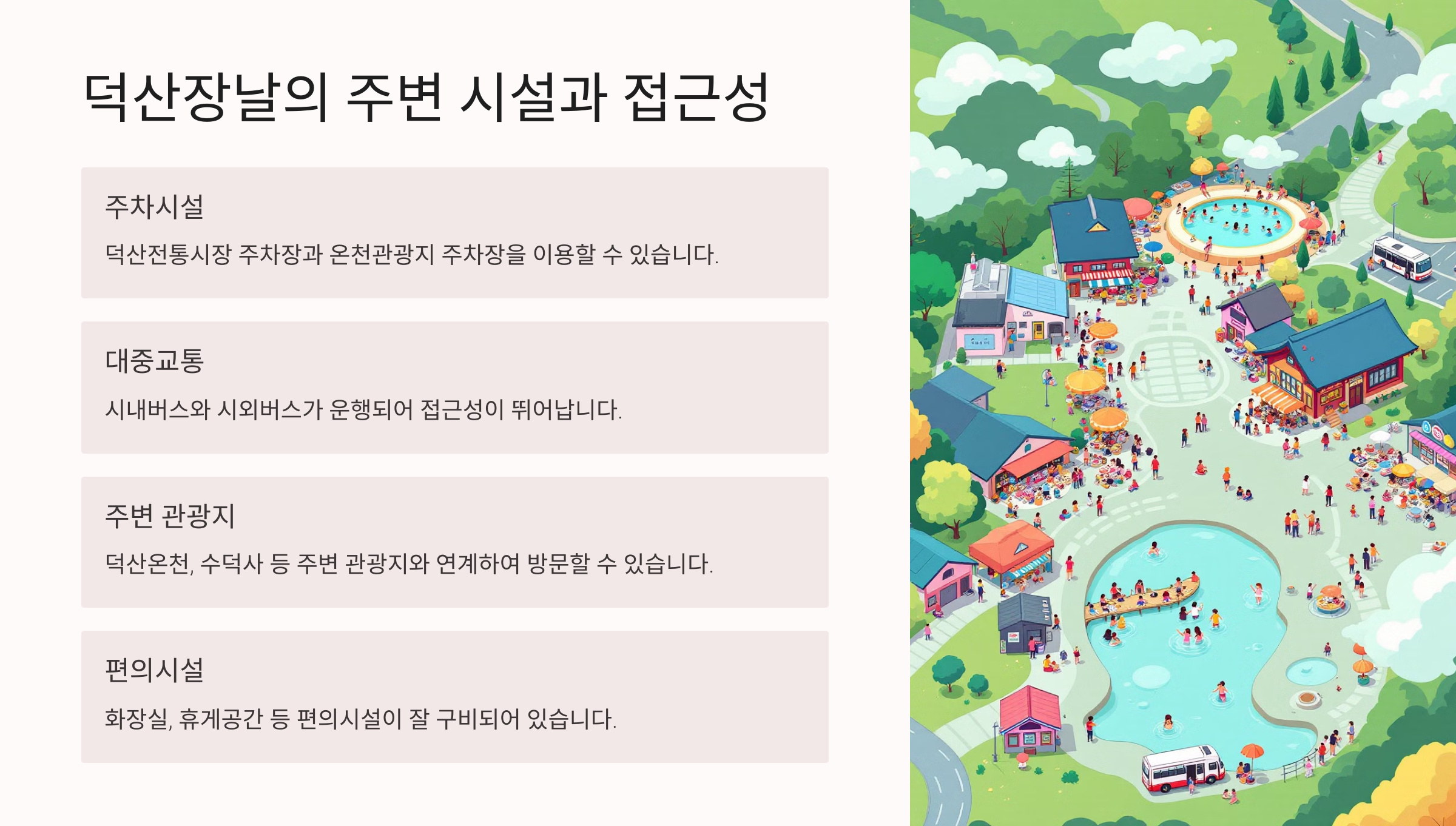 현재의 덕산5일장은 전통을 계승하면서도 현대적 편의시설을 갖추어 온천 관광과 전통시장의 조화를 이루고 있습니다.