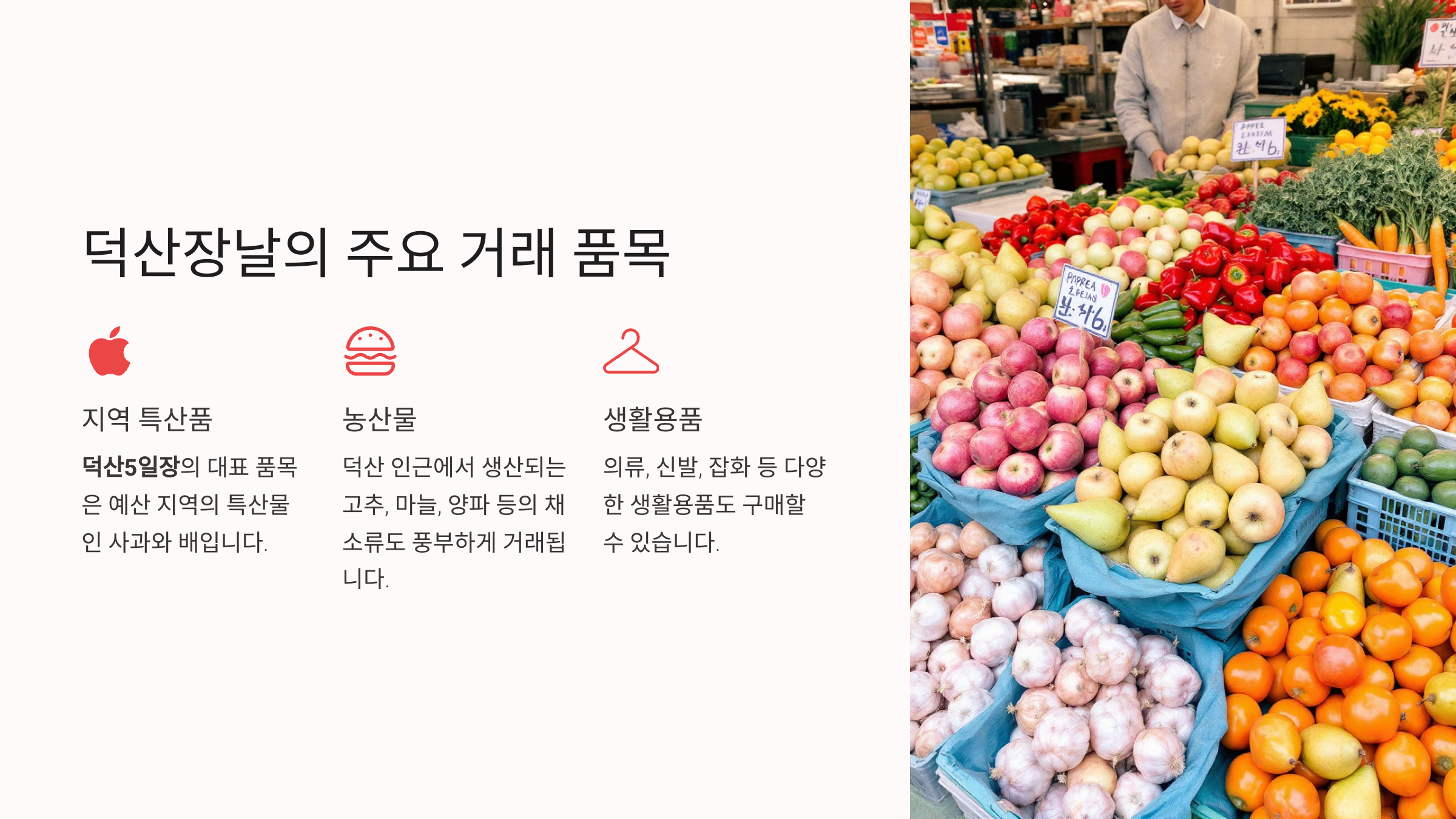덕산5일장의 대표 품목은 예산 지역의 특산물인 사과와 배입니다. 또한 덕산 인근에서 생산되는 고추, 마늘, 양파 등의 채소류도 풍부하게 거래됩니다.