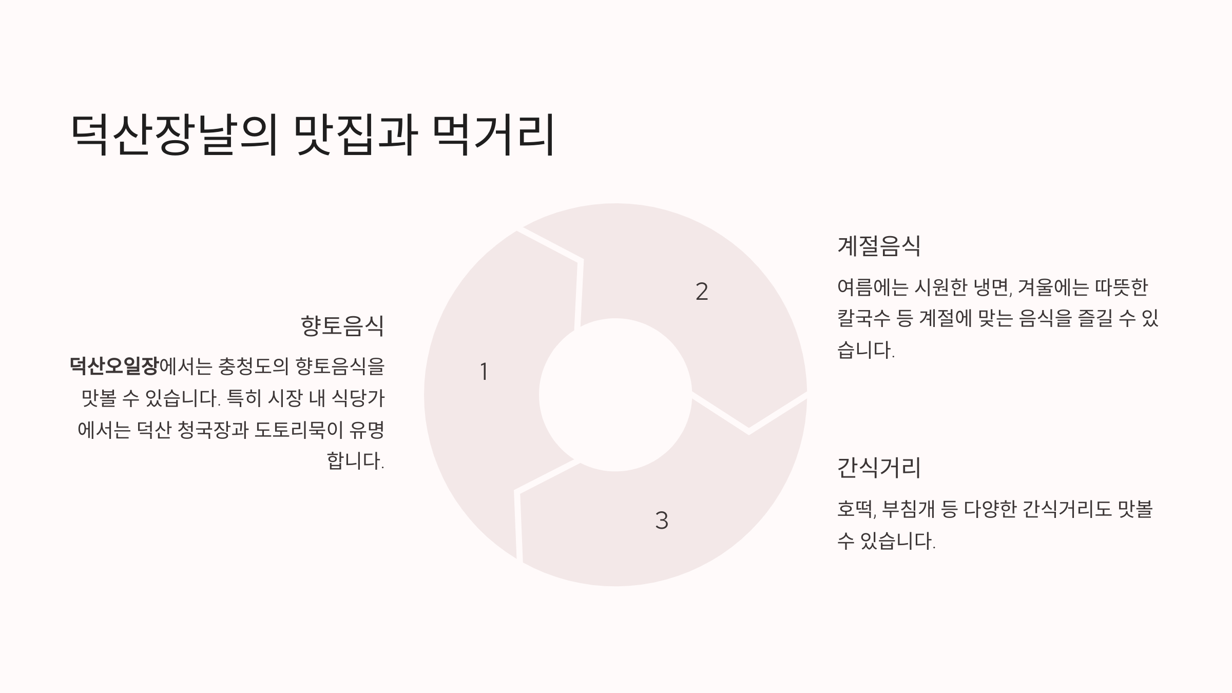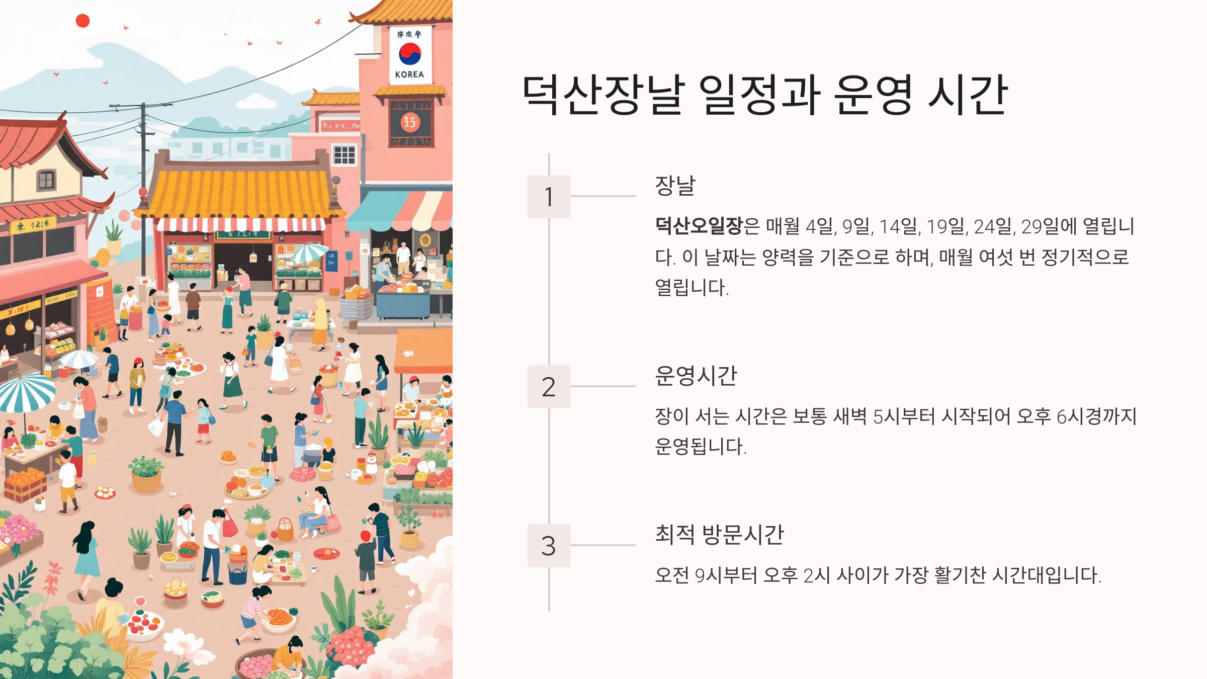 충청남도 예산군의 중심지인 덕산에서는 오랜 전통을 이어온 덕산5일장이 정기적으로 열립니다. 덕산온천으로 유명한 이 지역의 덕산장날은 지역 주민들의 삶의 터전이자 관광객들의 필수 방문 코스로 자리 잡았습니다. 이번 글에서는 덕산오일장의 모든 것을 상세히 알아보겠습니다.