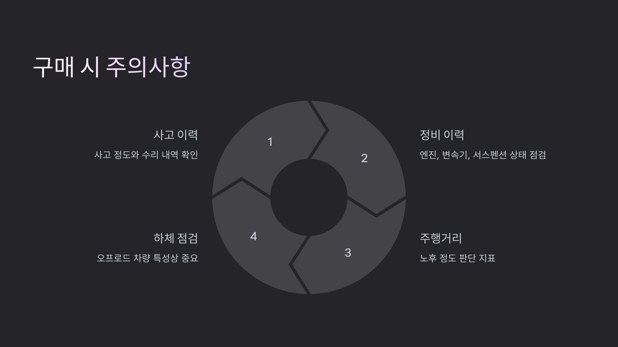 디펜더 110 중고차를 구매할 때는 실내 공간과 적재 공간을 꼼꼼하게 확인하고, 시승을 통해 승차감을 직접 느껴보는 것이 좋습니다. 또한, 차량의 정비 이력을 확인하여 정기적인 점검과 관리가 이루어졌는지 확인하는 것이 중요합니다.