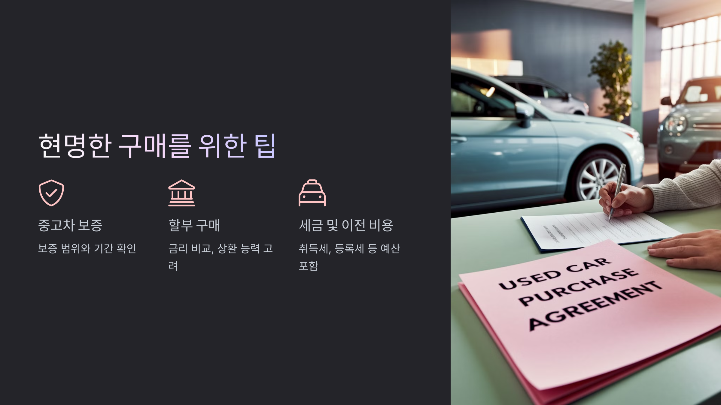 - 중고차 보증: 중고차 구매 시 보증 서비스를 제공하는 업체를 선택하면, 차량에 문제가 발생했을 때 수리비를 절약할 수 있습니다. 보증 범위와 기간을 꼼꼼하게 확인하고, 필요하다면 추가 보증 가입을 고려해 보세요.