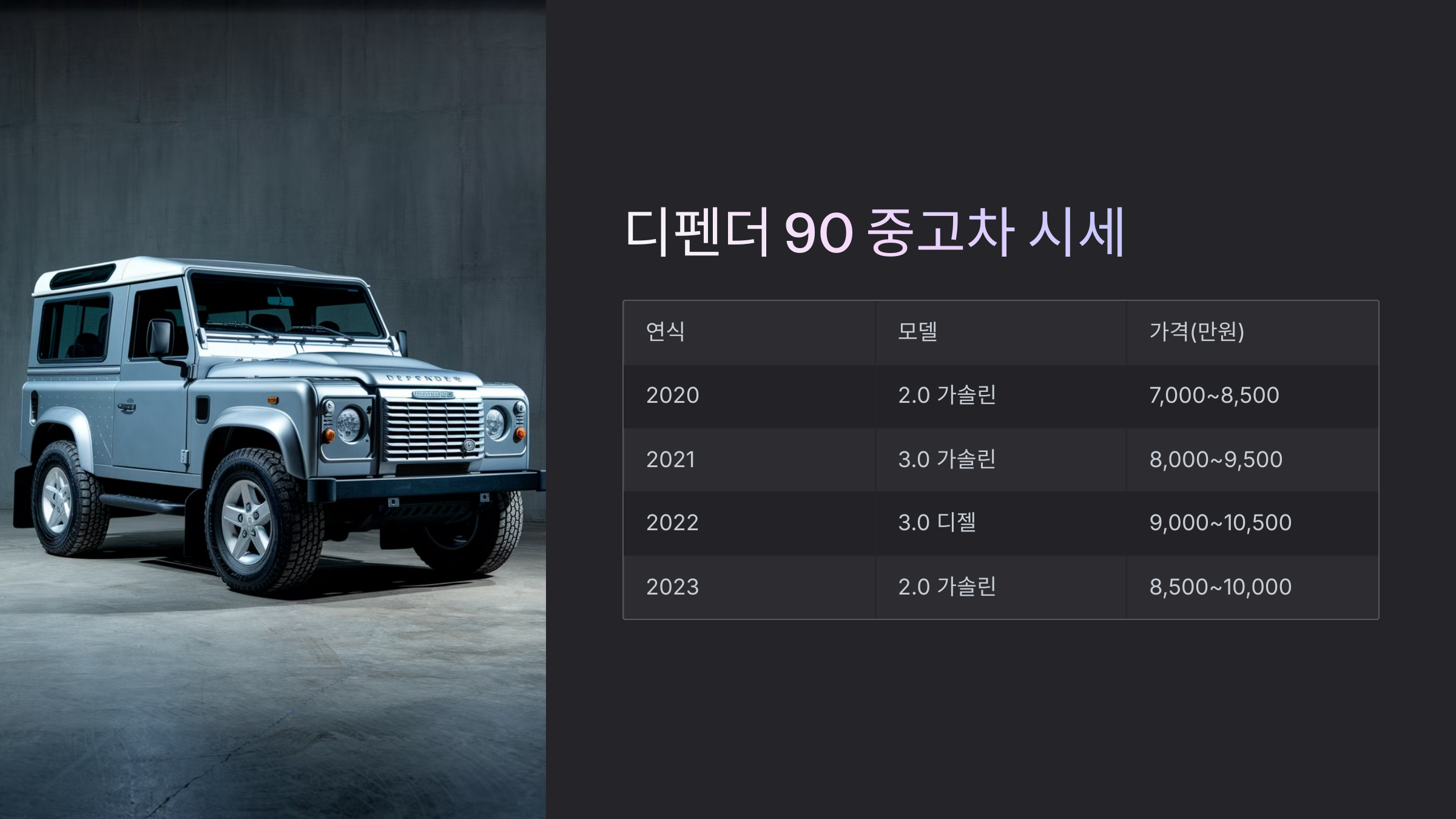 주의: 위 가격은 참고용이며, 실제 랜드로버 디펜더 중고차 가격은 차량 상태 및 시장 상황에 따라 변동될 수 있습니다.