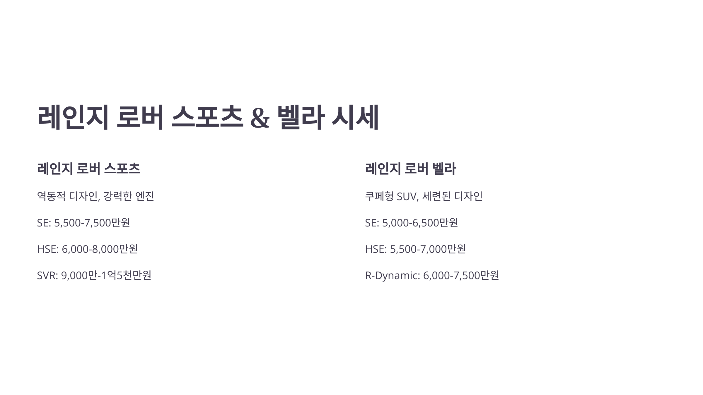- 예산 설정: 원하는 연식과 모델의 랜드로버 레인지 로버 중고 시세를 미리 파악하면, 예산 계획을 세우는 데 도움이 됩니다.