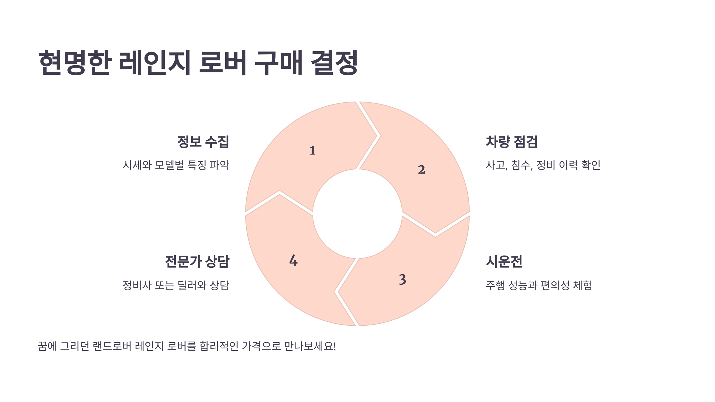 - 온라인 커뮤니티: 랜드로버 관련 온라인 커뮤니티에서 랜드로버 레인지 로버 중고차 구매 경험자들의 의견을 참고합니다.
