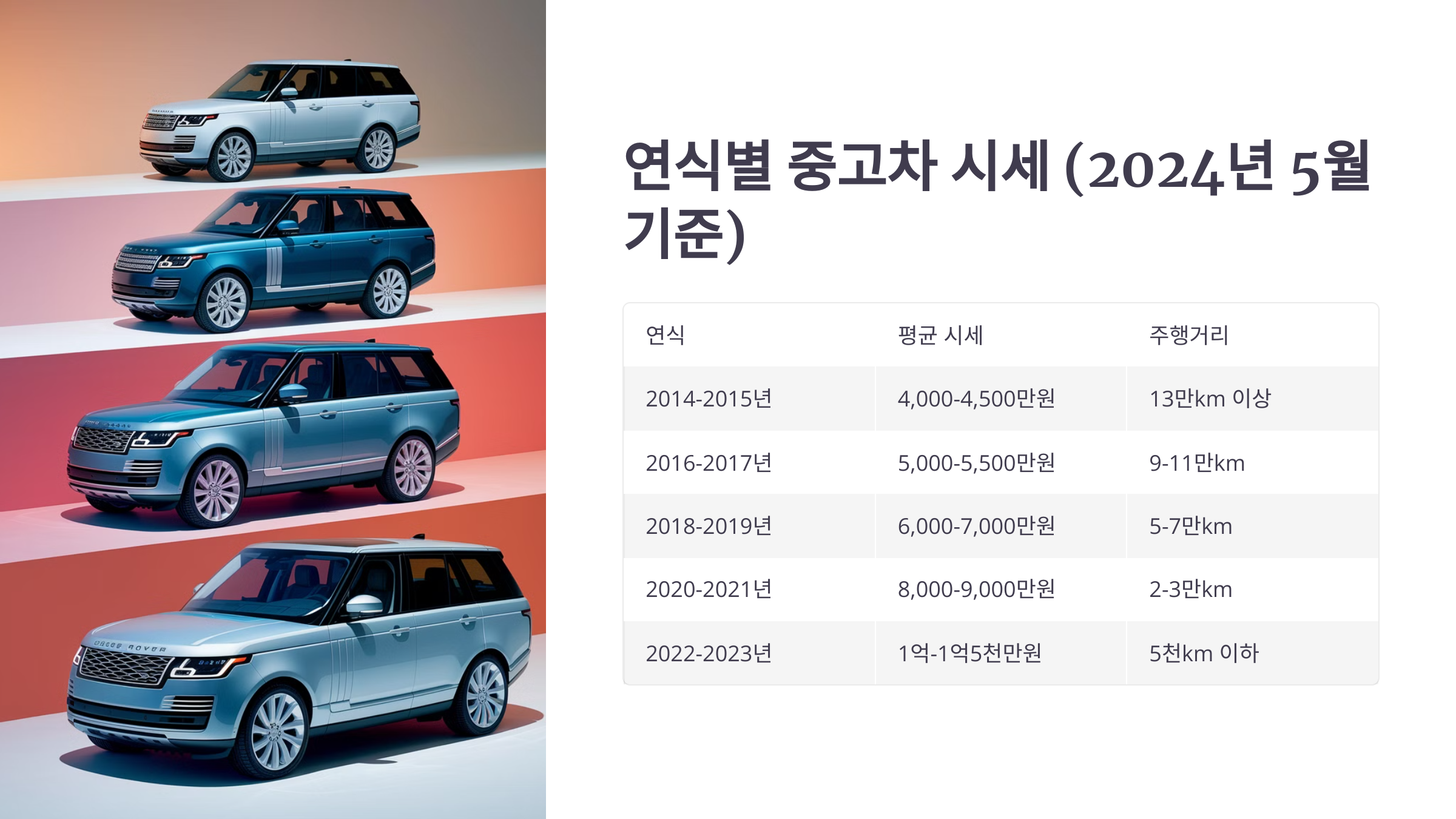 랜드로버 레인지 로버는 고가의 차량인 만큼, 중고차 시장에서도 가격 변동 폭이 큽니다. 연식, 주행거리, 사고 유무, 트림, 옵션 등 다양한 요소에 따라 랜드로버 레인지 로버 중고 가격이 천차만별로 달라지기 때문에, 정확한 시세를 파악하는 것은 매우 중요합니다.