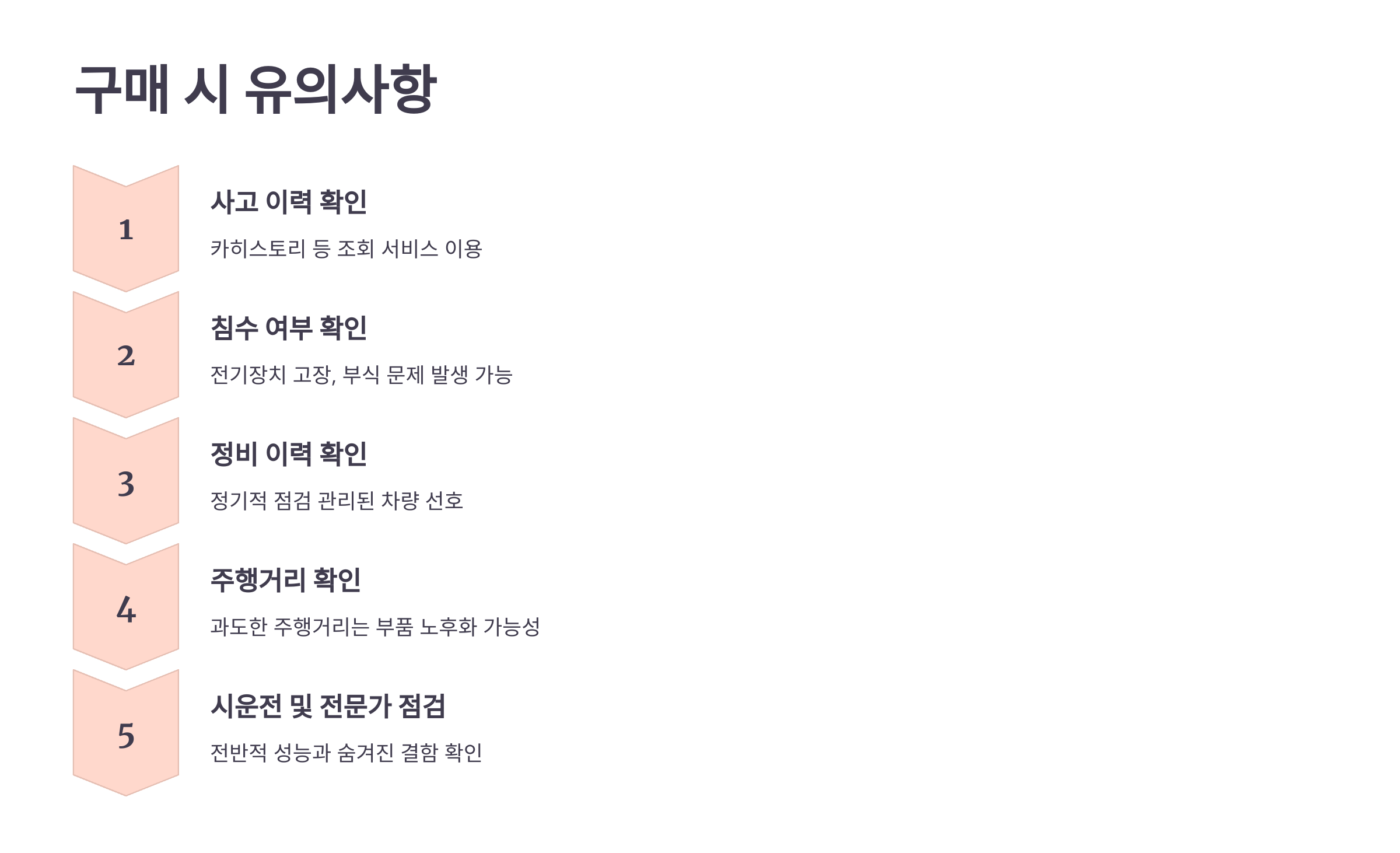 - 침수 여부 확인: 침수된 차량은 전기 장치 고장, 부식 등 심각한 문제가 발생할 수 있으므로, 반드시 침수 여부를 확인해야 합니다.