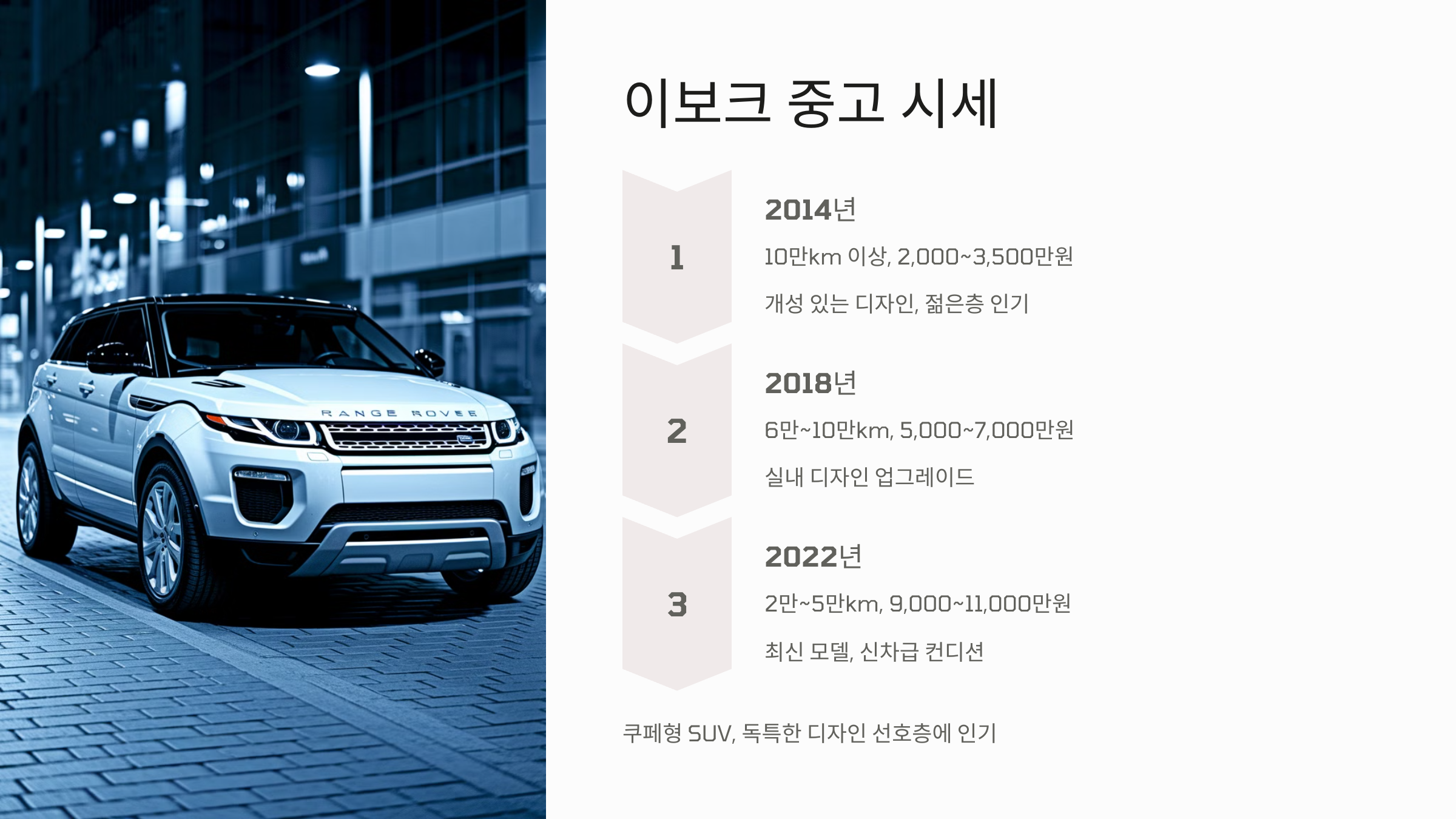 참고사항: 이보크는 쿠페형 SUV로, 독특한 디자인을 선호하는 사람들에게 인기가 높습니다.