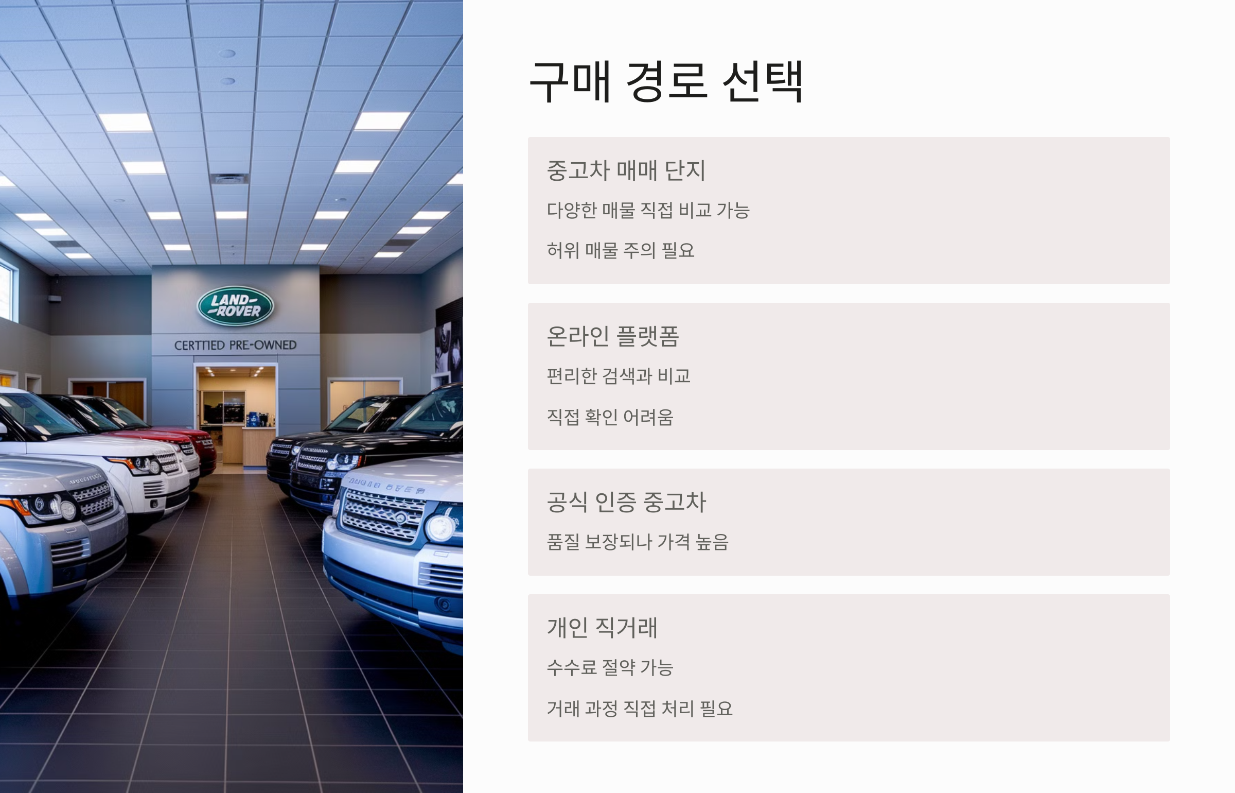 - 중고차 매매 단지: 다양한 랜드로버 중고차 매물을 직접 비교해보고 구매할 수 있습니다. 하지만 허위 매물이나 불량 매물이 있을 수 있으므로 주의해야 합니다.