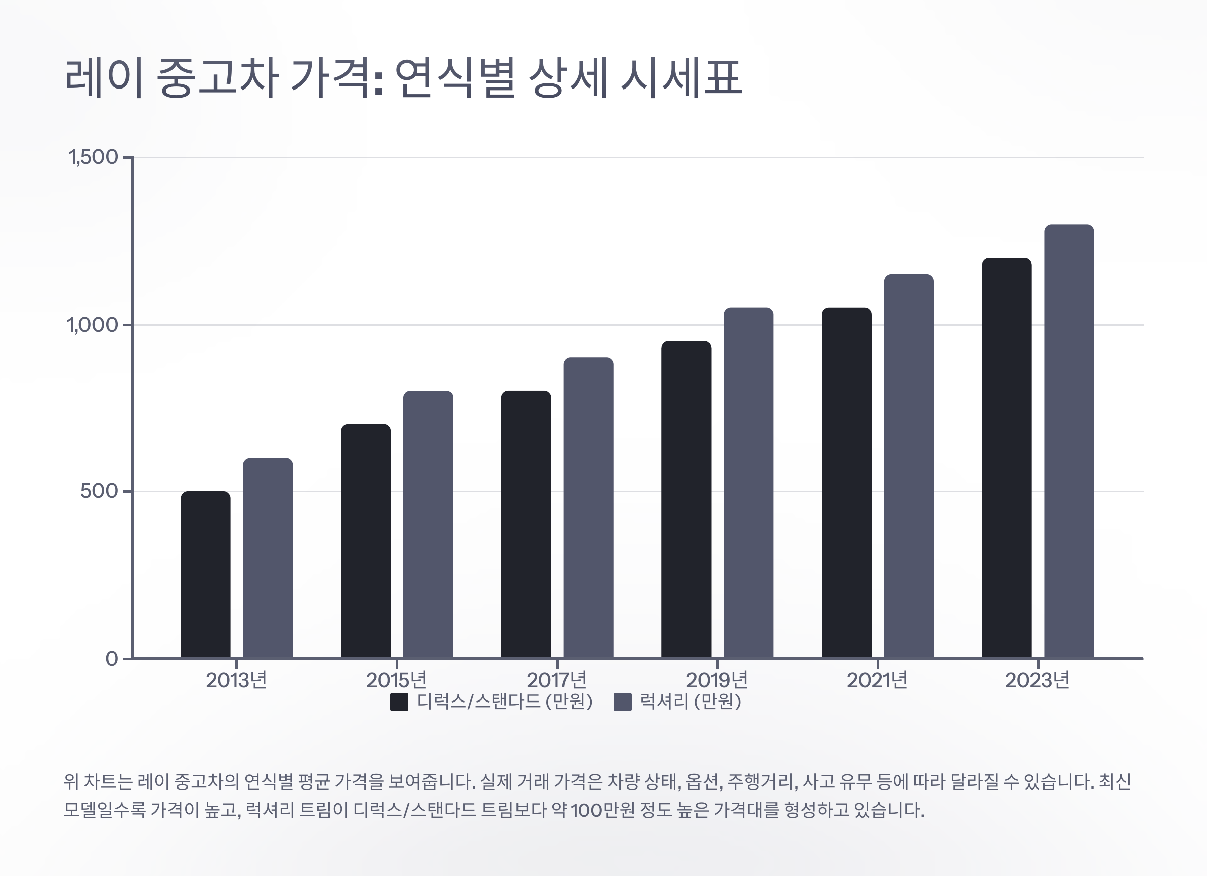 | 럭셔리 | 1,000 ~ 1,200 | 2만 이상 | 풀옵션 모델은 가격이 높게 형성. | |