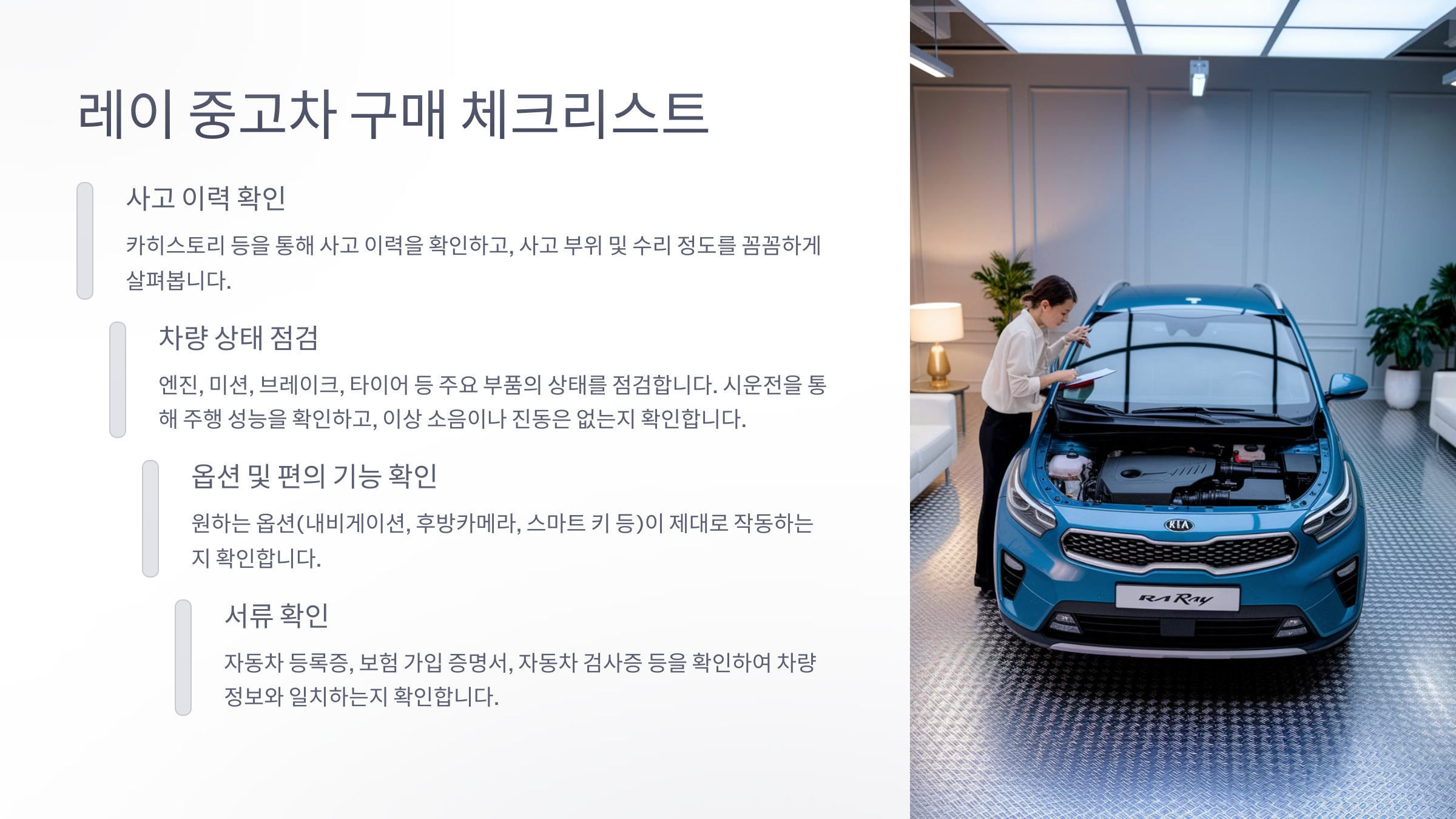 레이 중고 시세를 확인했다면, 이제 실제 차량을 꼼꼼하게 살펴봐야 합니다. 다음은 레이 중고차 구매 시 반드시 확인해야 할 체크리스트입니다.