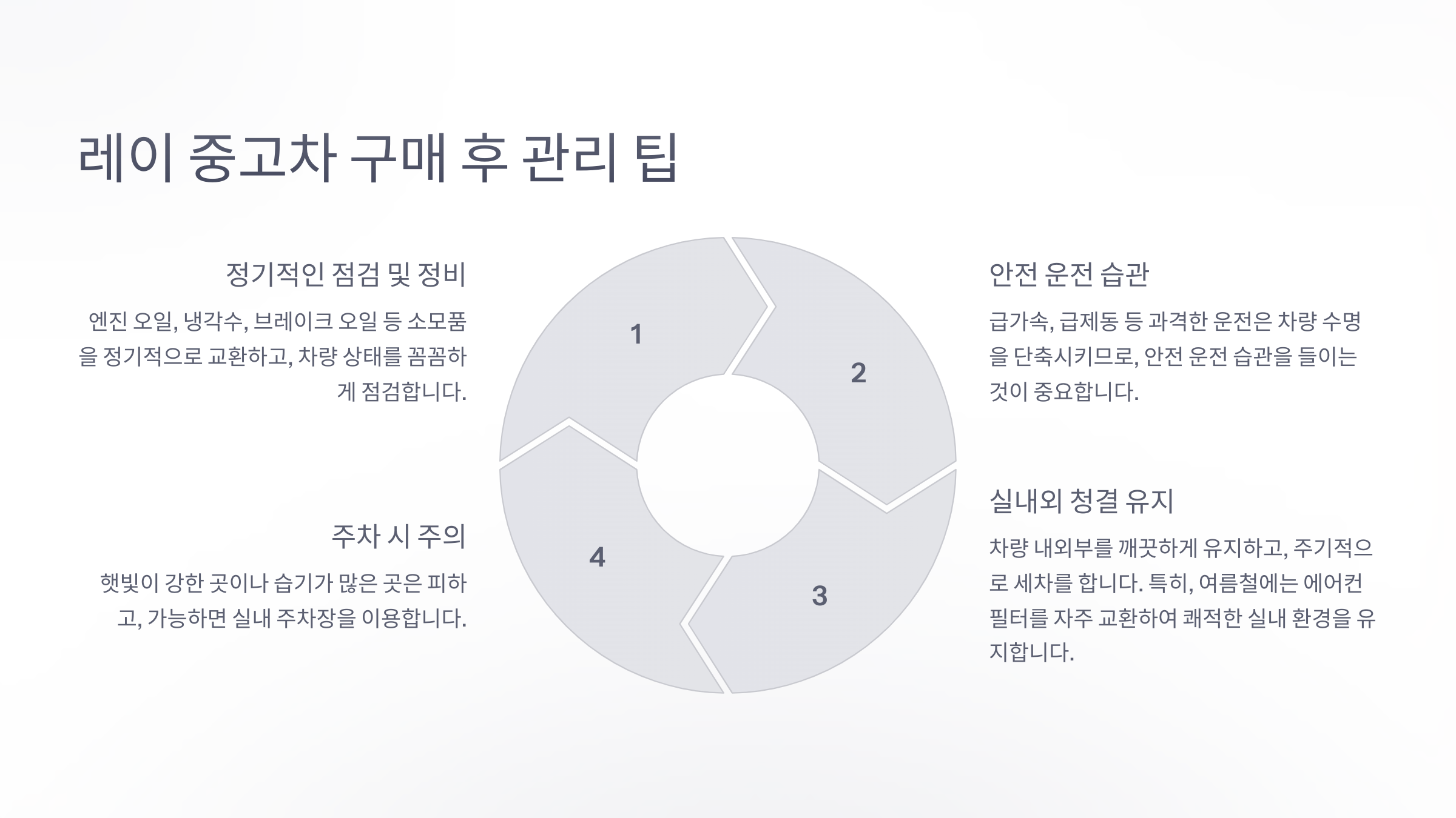 레이 중고차를 구매했다면, 꾸준한 관리를 통해 차량의 수명을 연장하고 최상의 컨디션을 유지하는 것이 중요합니다.
