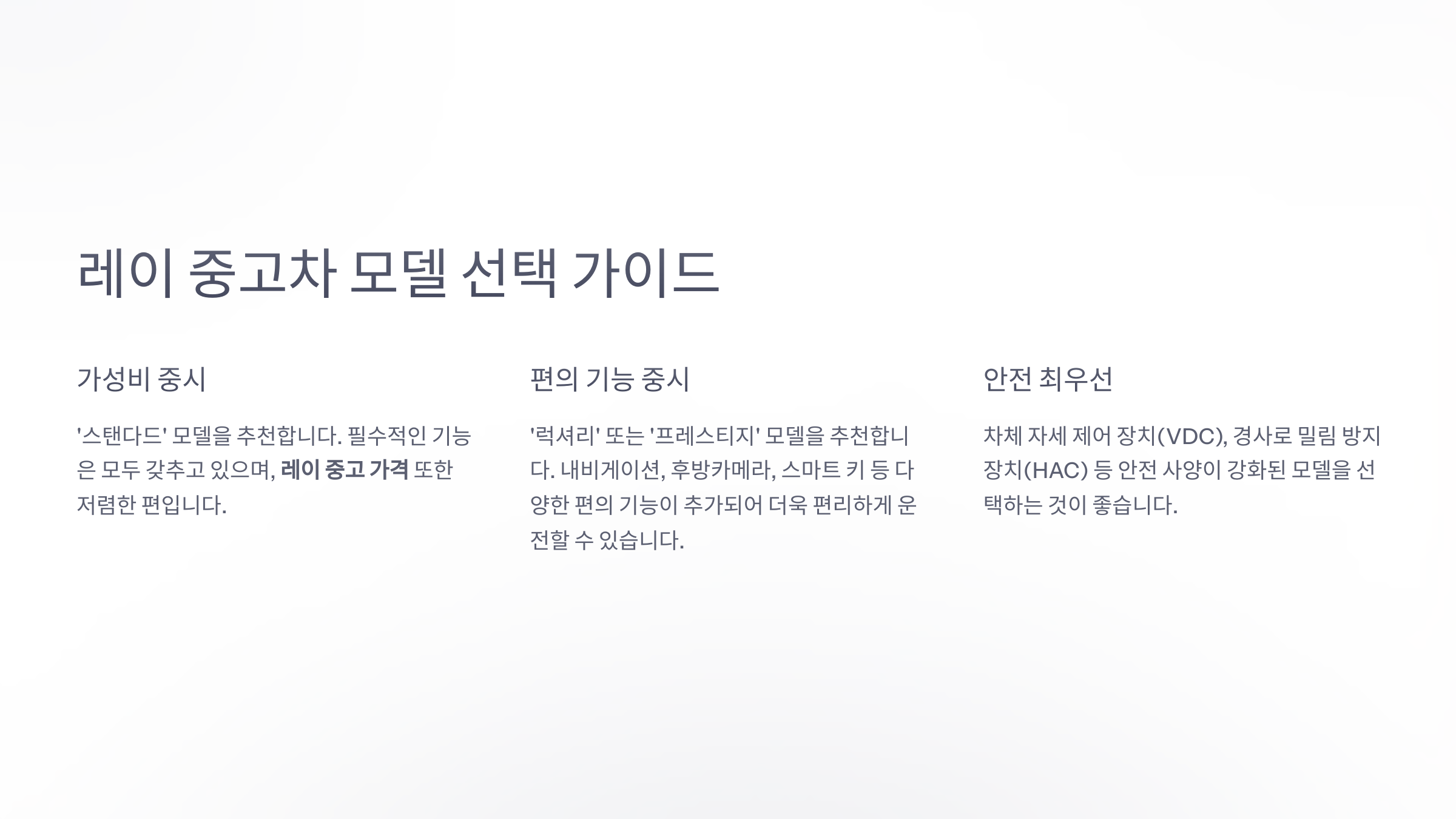 - 가성비를 중시한다면: 기본 트림인 '스탠다드' 모델을 추천합니다. 필수적인 기능은 모두 갖추고 있으며, 레이 중고 가격 또한 저렴한 편입니다.