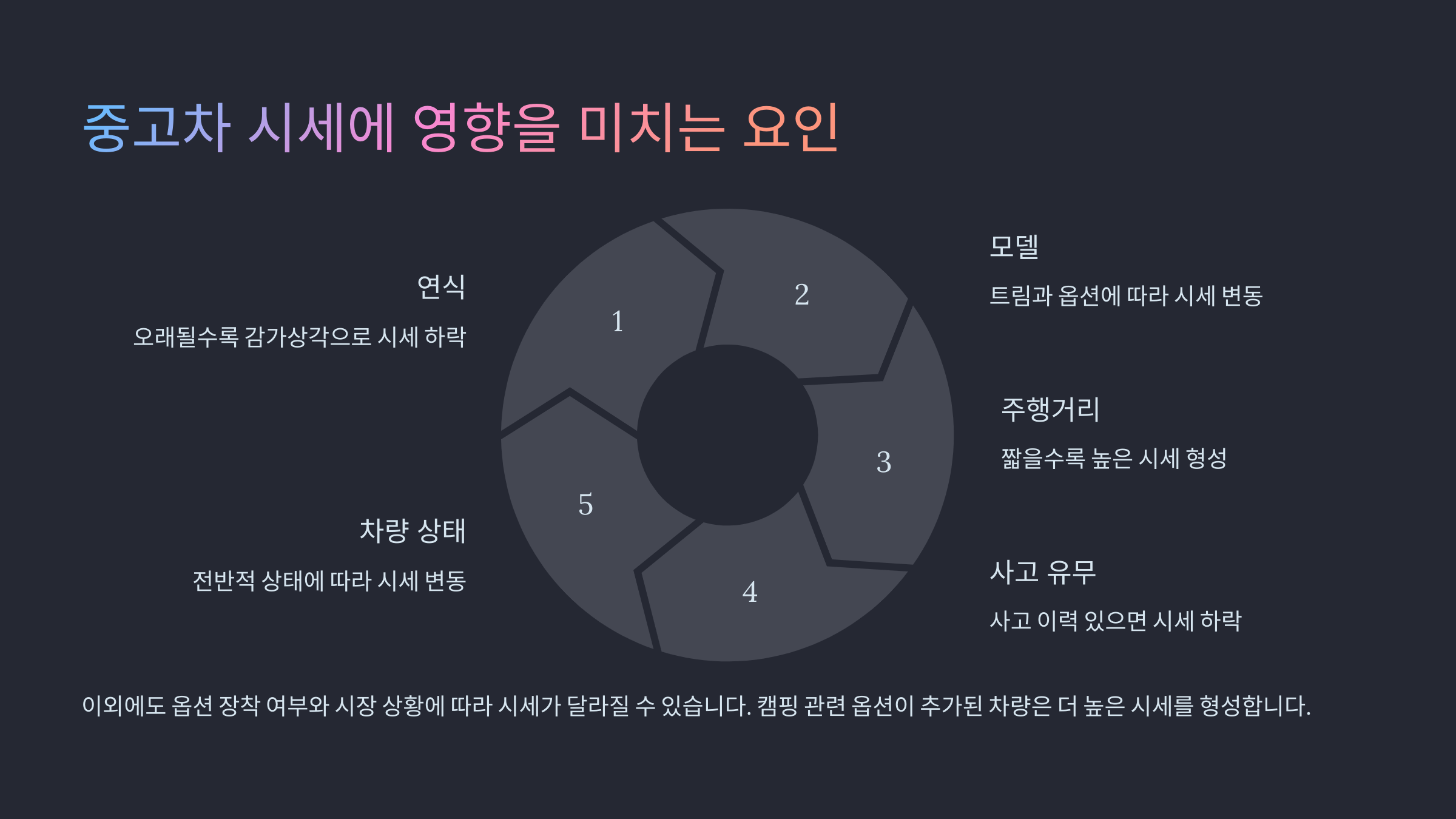 - 연식: 일반적으로 연식이 오래될수록 감가상각이 진행되어 시세가 하락합니다.