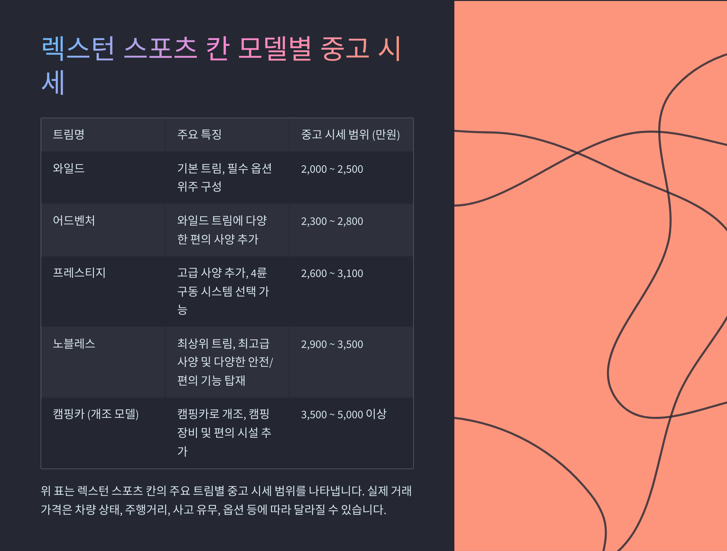 | 2023년 | 렉스턴 스포츠 칸 | 3,000 ~ 3,500 | 최신 연식 모델, 캠핑 관련 옵션 추가 여부에 따라 가격 변동폭 큼. |
