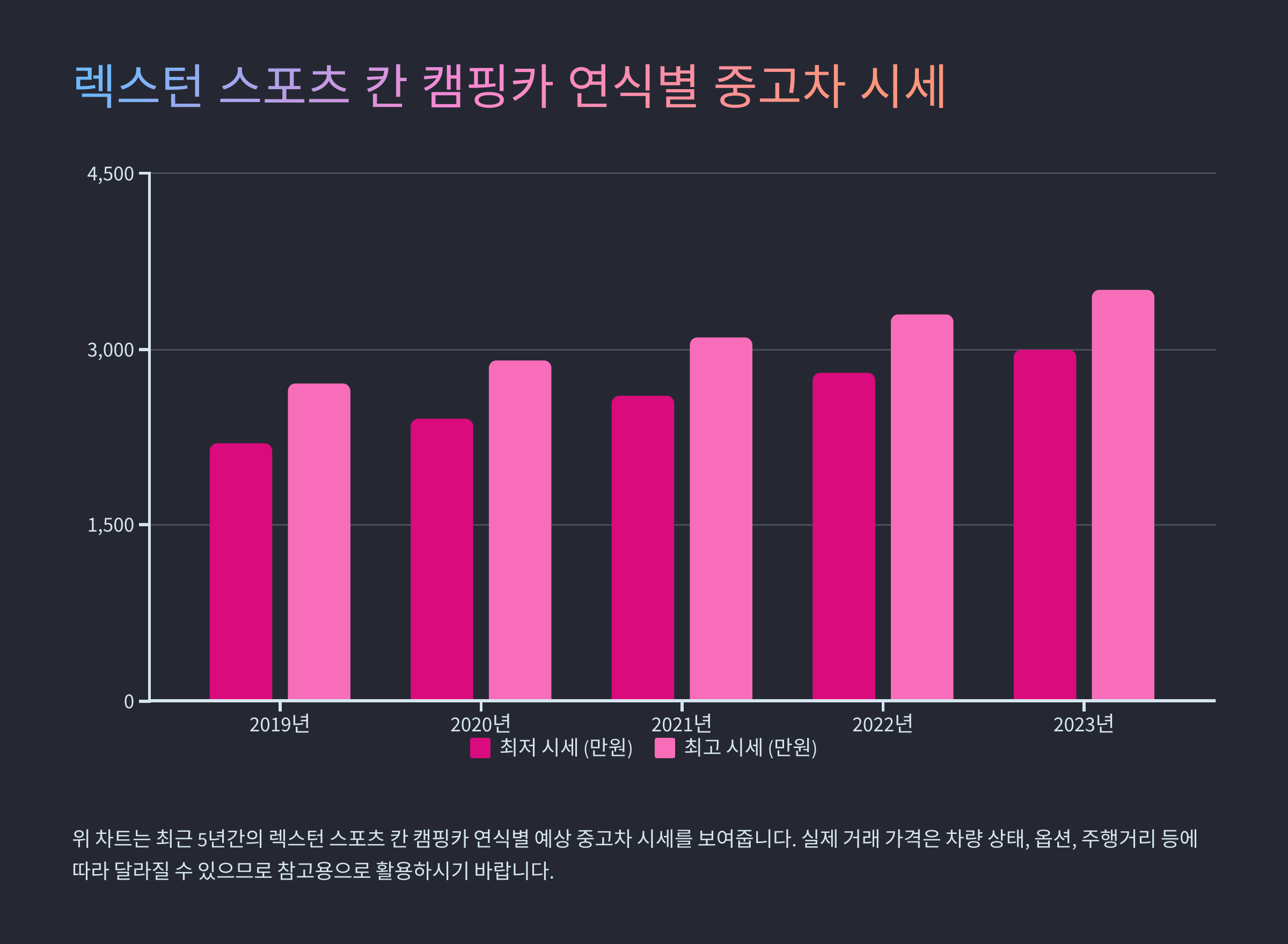 아래 표는 렉스턴 스포츠 칸 캠핑카의 연식별 예상 중고차 시세를 나타냅니다. 실제 거래 가격은 차량 상태, 옵션, 주행거리 등에 따라 달라질 수 있으므로 참고용으로 활용하시기 바랍니다.