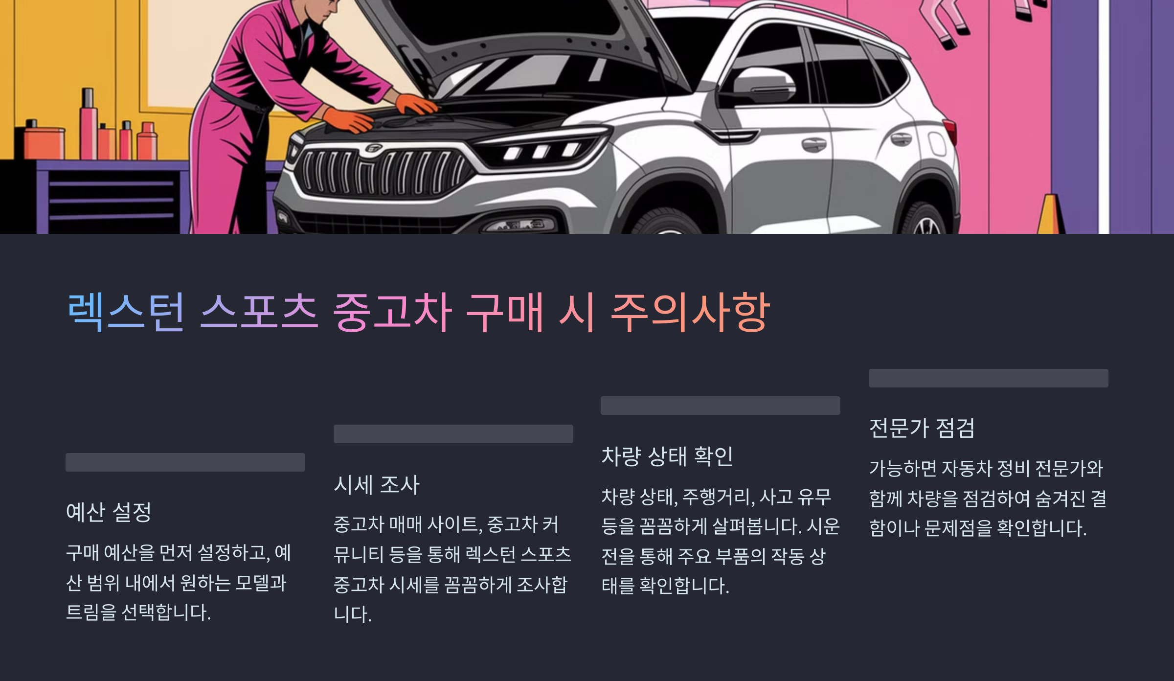 - 시세 조사: 중고차 매매 사이트, 중고차 커뮤니티 등을 통해 렉스턴 스포츠 중고차 시세를 꼼꼼하게 조사합니다.