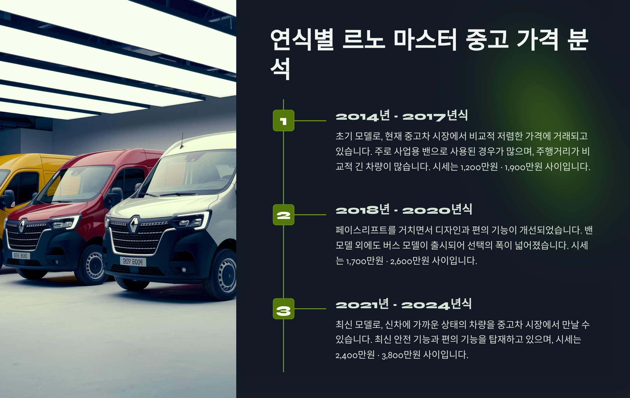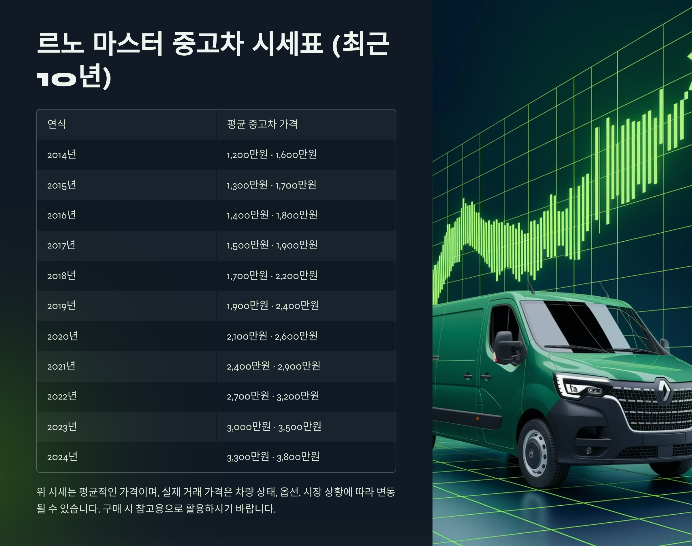르노 마스터 중고차 가격은 연식에 따라 큰 차이를 보입니다. 각 연식별 특징과 시세를 자세히 알아보겠습니다.