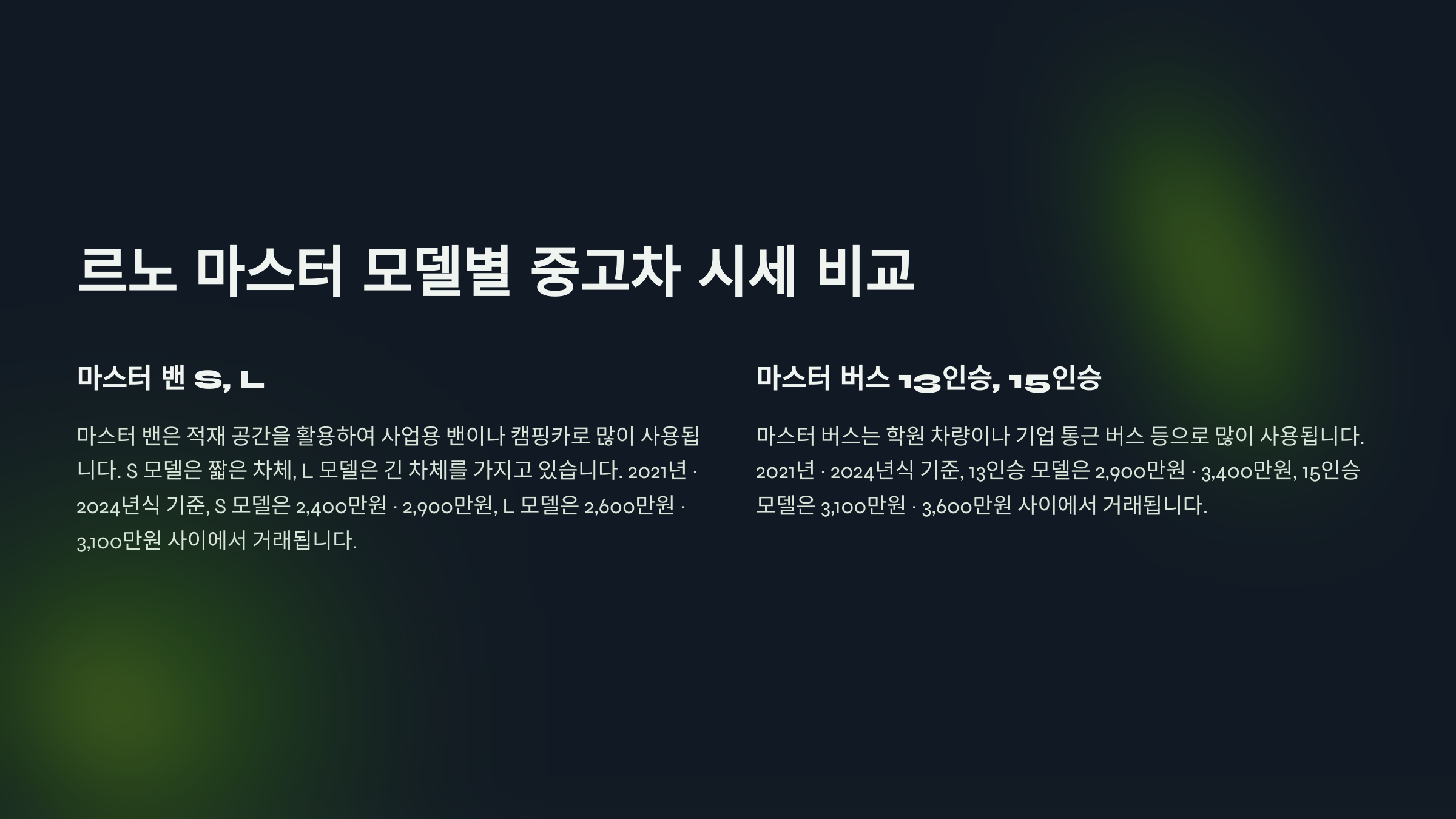 - 장점: 저렴한 가격으로 르노 마스터를 경험할 수 있다는 장점이 있습니다. 예산이 부족한 사업자나 개인에게 적합한 선택이 될 수 있습니다.