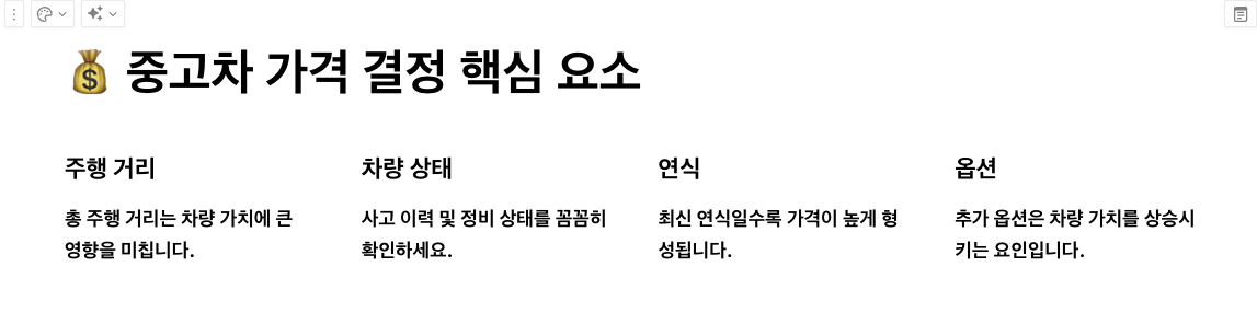 | 사고 유무 | 무사고 차량이 훨씬 높은 가격에 거래됨 |