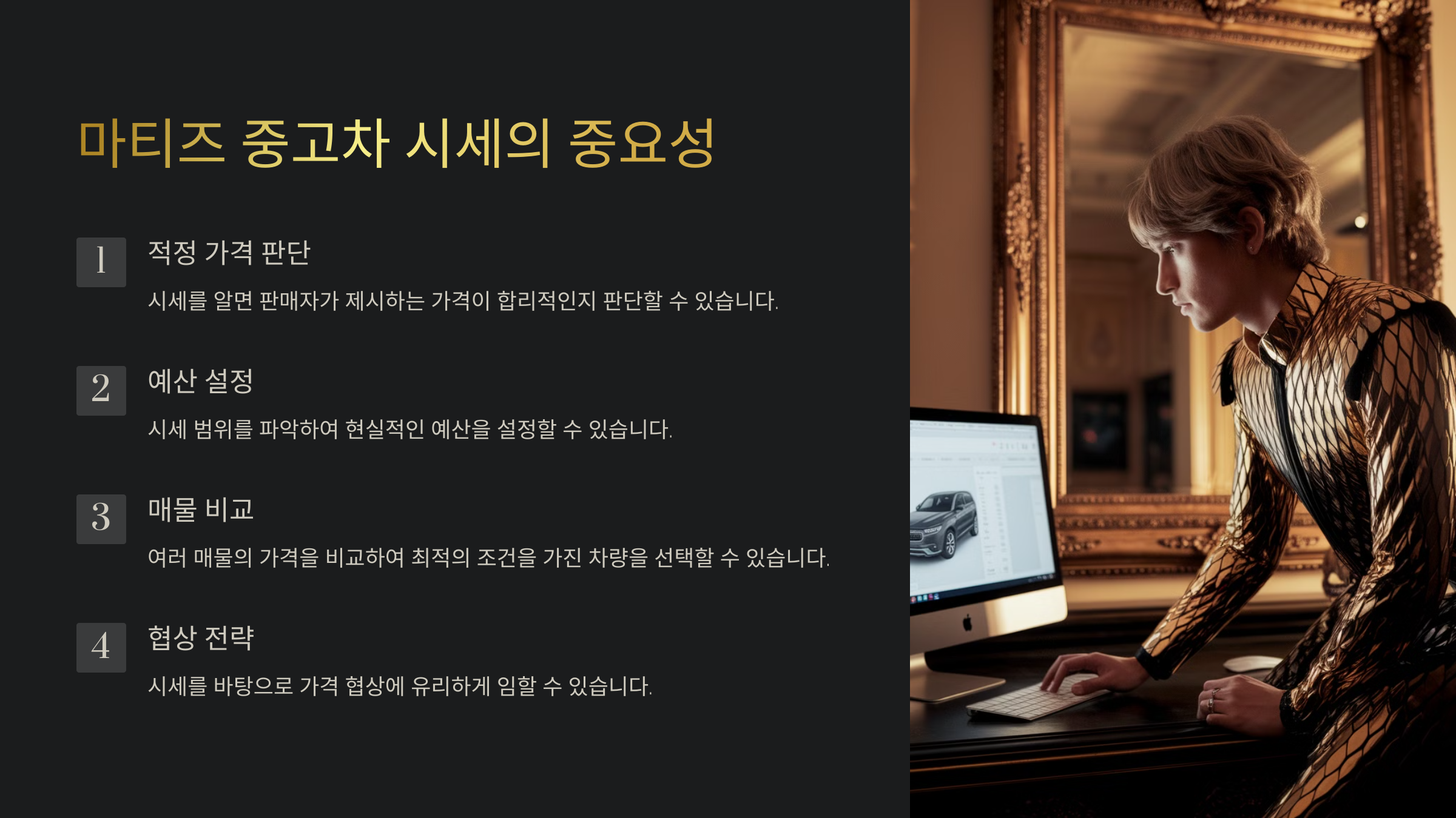 중고차 구매는 신차 구매와 달리 정보 비대칭성이 크기 때문에 꼼꼼한 시세 조사가 필수적입니다. 마티즈는 연식, 모델, 주행거리, 사고 유무 등에 따라 가격이 크게 달라질 수 있습니다. 따라서 정확한 마티즈 중고차 시세를 파악하지 않고 섣불리 구매하면 손해를 볼 수 있습니다.