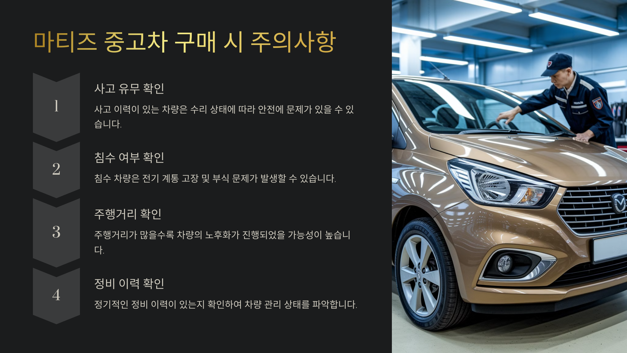마티즈 중고차를 구매하기 전에 반드시 다음 사항들을 확인해야 합니다.