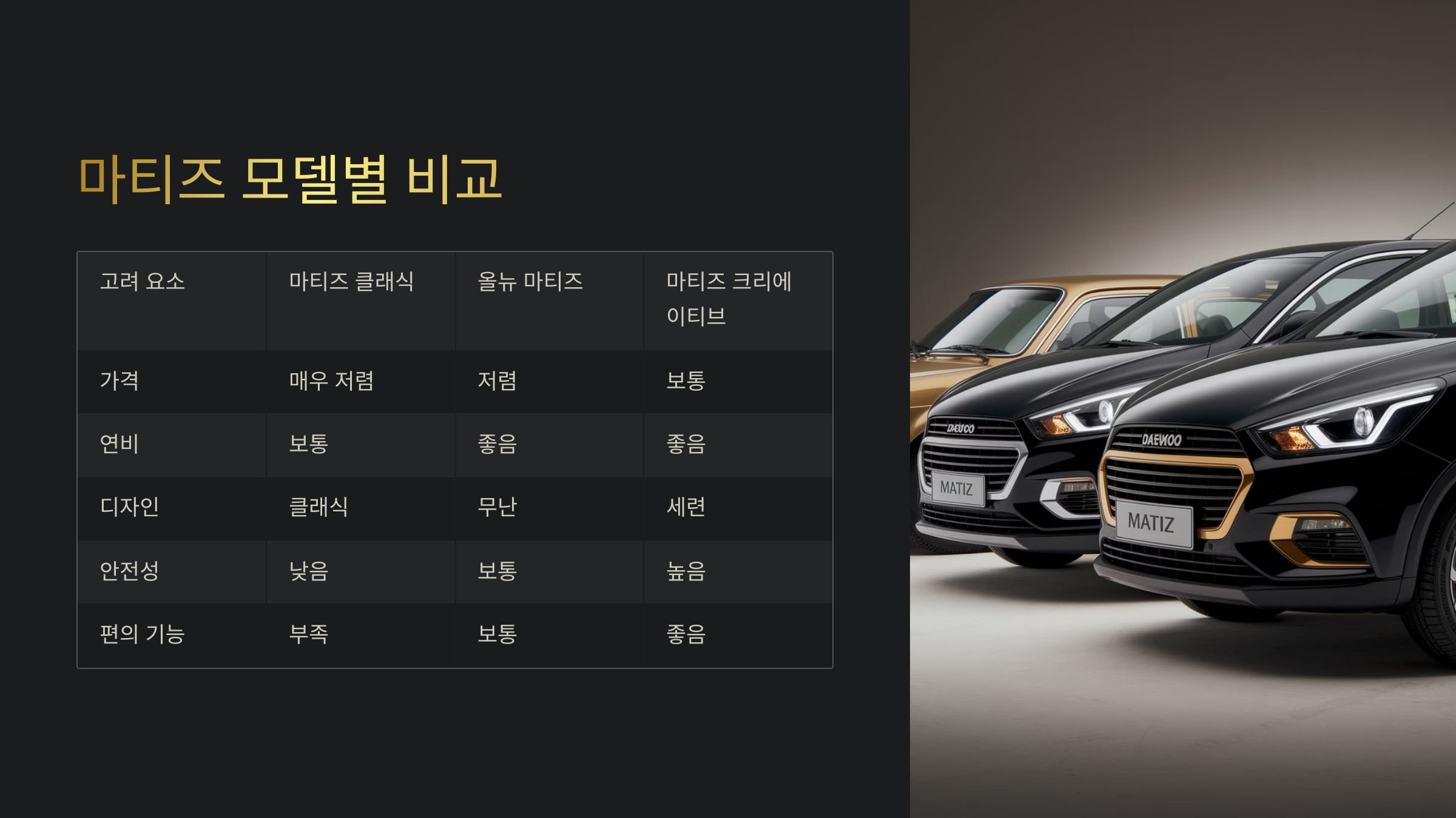 | 고려 요소 | 마티즈 클래식 | 올뉴 마티즈 | 마티즈 크리에이티브 |