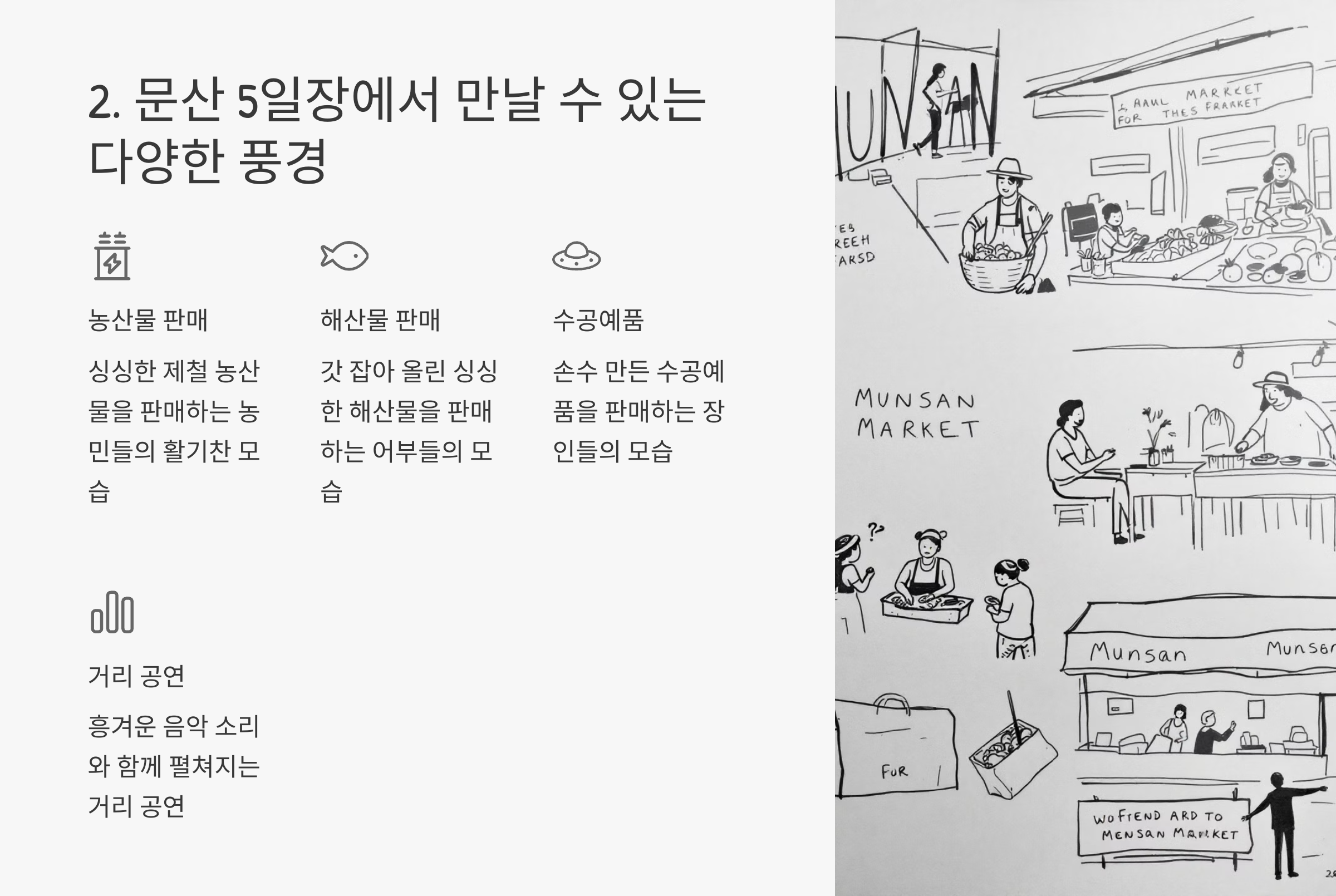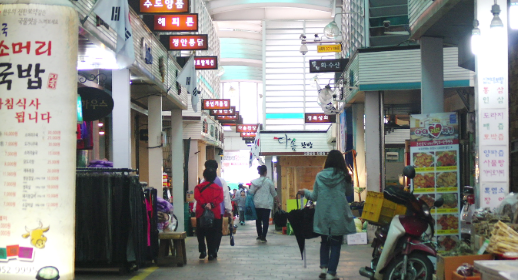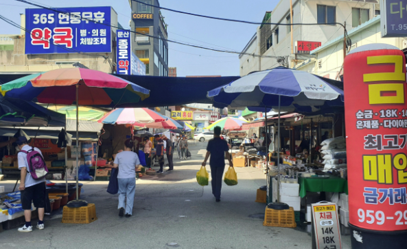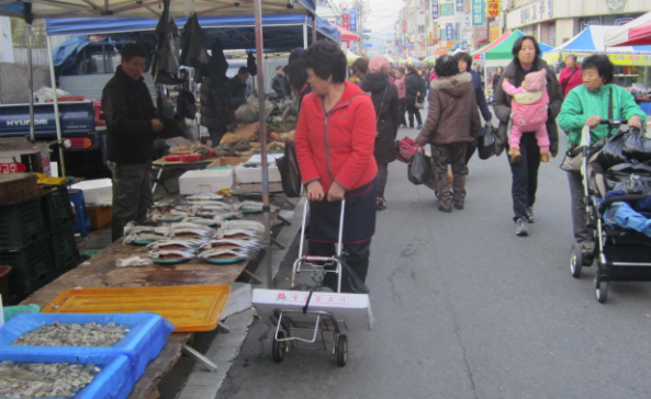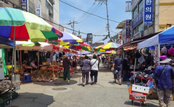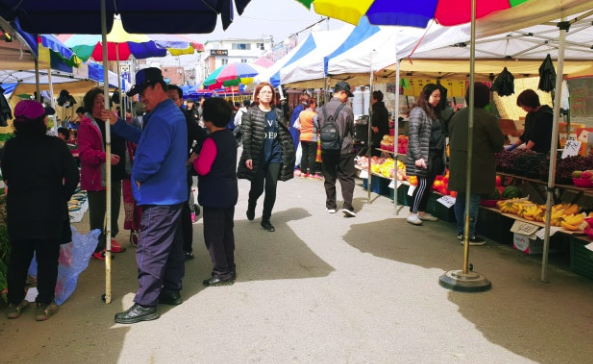 | 주요 풍경 | 농산물 판매, 해산물 판매, 수공예품 판매, 거리 공연, 상인들의 호객, 어르신들의 담소 |