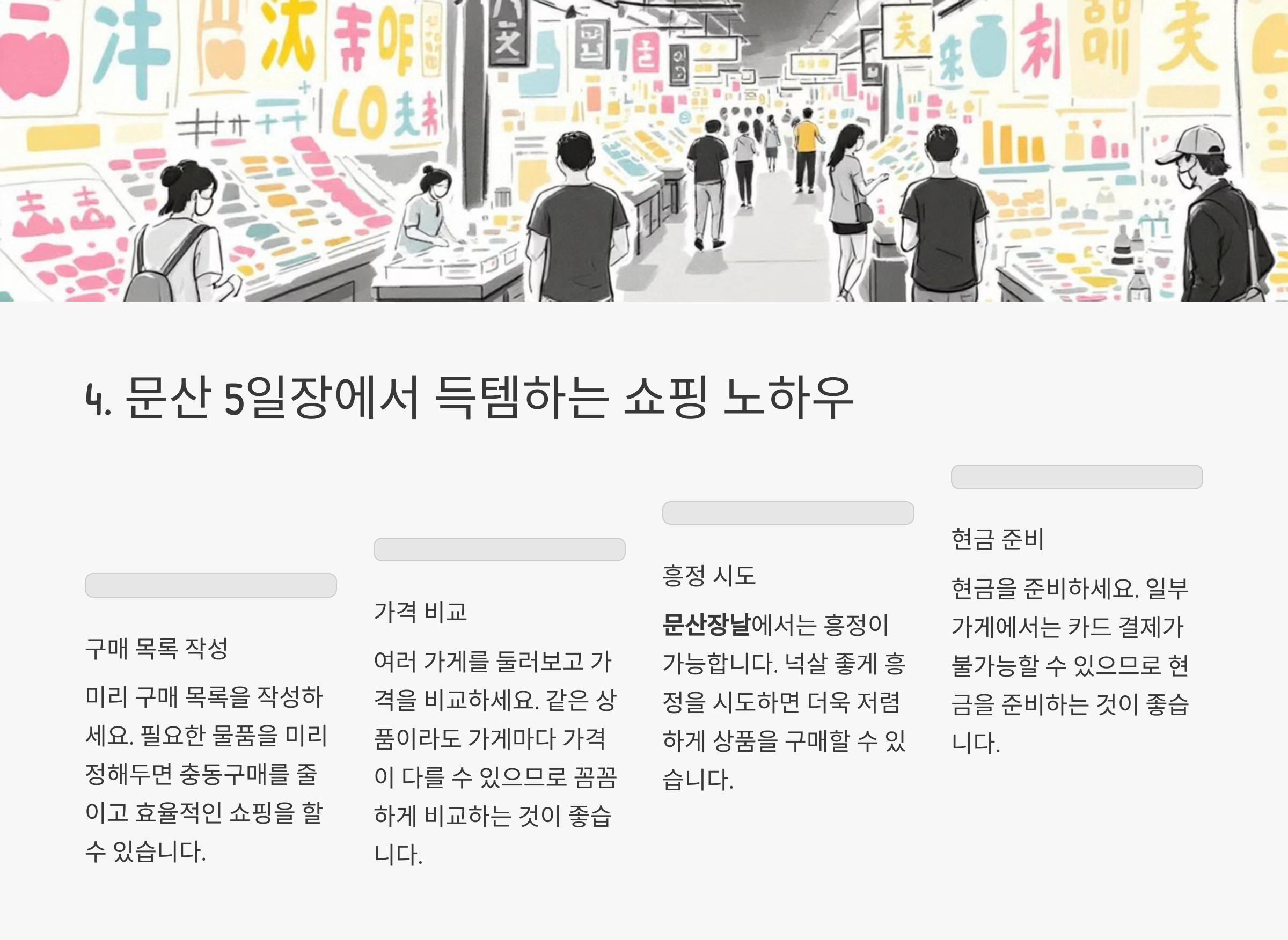 | 쇼핑 노하우 | 구매 목록 작성, 가격 비교, 흥정 시도, 현금 준비, 편안한 복장 |
