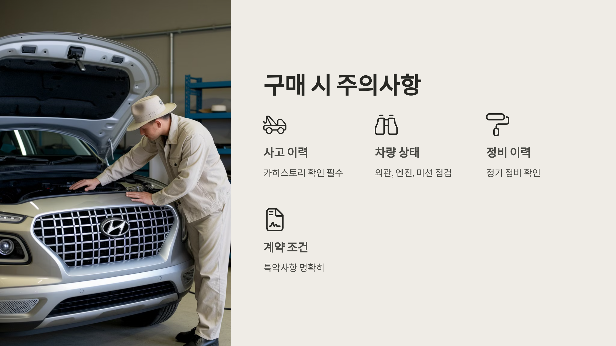 - 정비 이력 확인: 정기적인 정비 및 소모품 교환 이력을 확인하여 차량 관리 상태를 파악해야 합니다. 정비 이력이 잘 관리된 차량은 비교적 안심하고 구매할 수 있습니다.