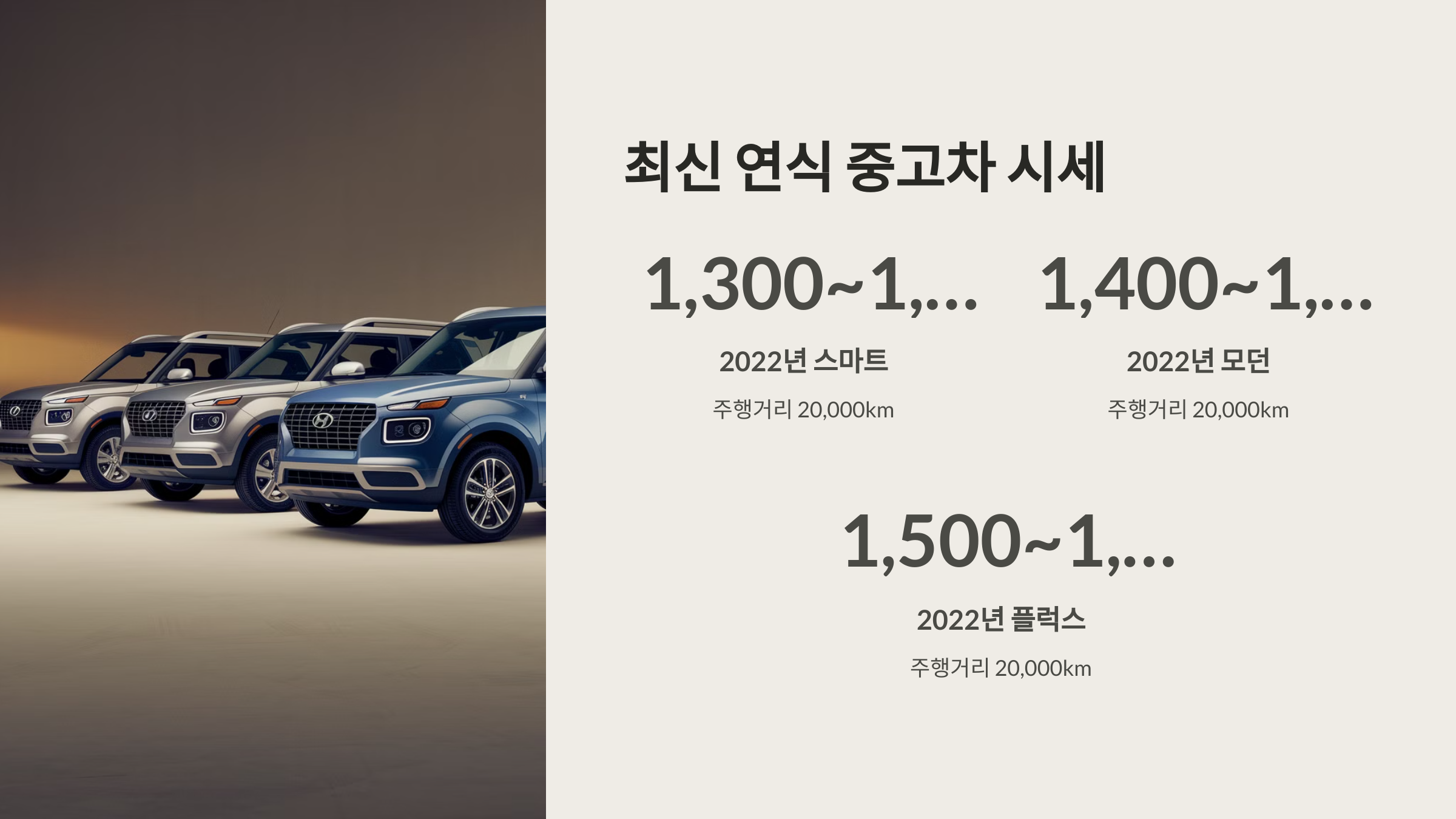 개성 넘치는 디자인과 뛰어난 연비로 꾸준한 인기를 얻고 있는 베뉴! 사회 초년생이나 세컨드카를 찾는 분들에게 특히 매력적인 차량입니다. 합리적인 가격으로 베뉴를 소유하고 싶다면 중고차 시장을 주목해볼 필요가 있습니다. 이 글에서는 베뉴 중고차 가격을 꼼꼼하게 분석하여, 최적의 구매 결정을 돕도록 하겠습니다. 베뉴 중고 시세 정보는 물론, 연식별, 모델별 베뉴 중고 가격 변동 추이까지 상세하게 알아보겠습니다.