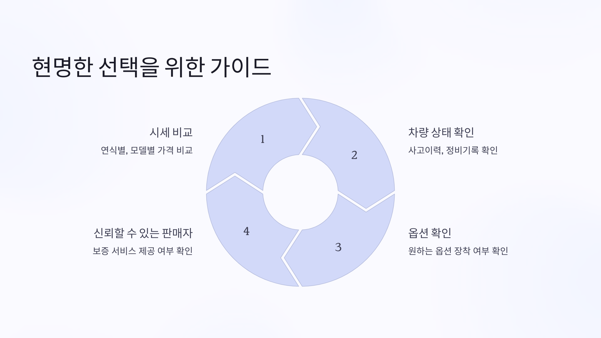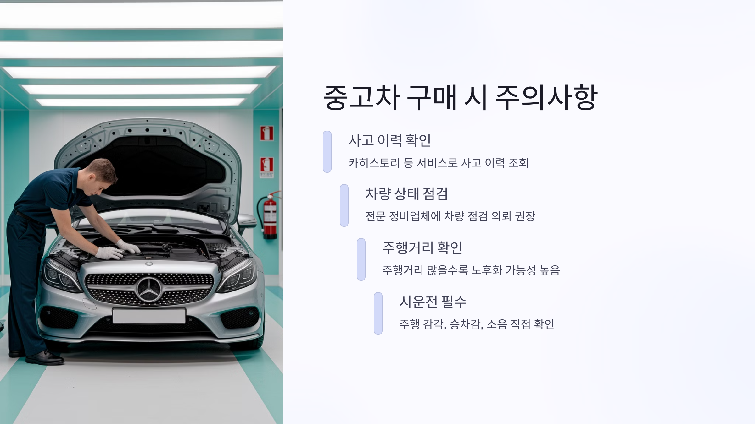 - 시운전: 반드시 시운전을 통해 차량의 주행 감각, 승차감, 소음 등을 직접 확인해야 합니다.