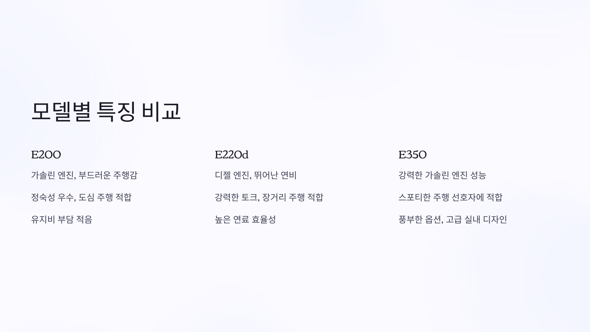 벤츠 E클래스 모델별 특징 비교: E200, E220d, E350