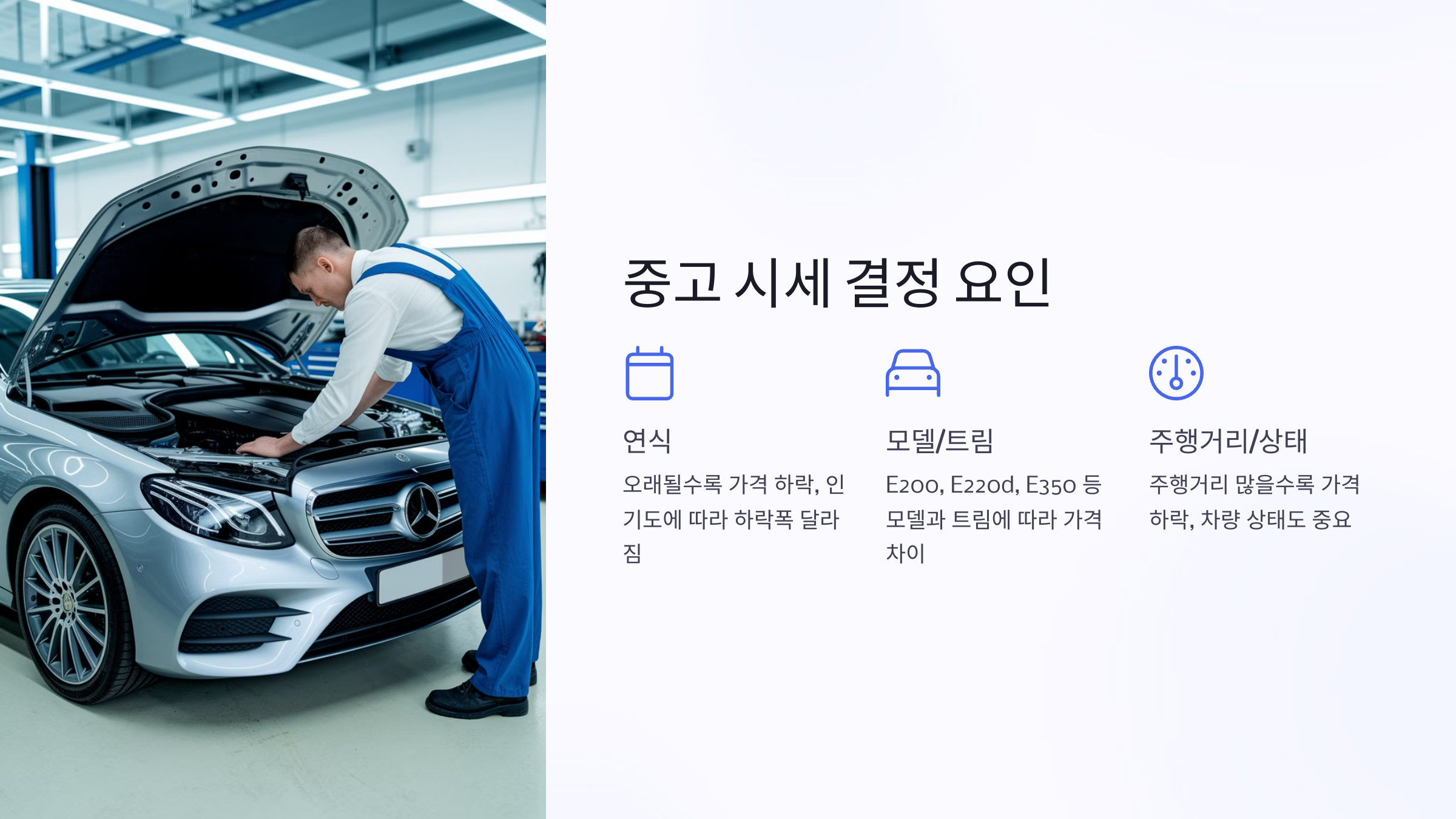 벤츠 E클래스 중고 가격은 다음과 같은 요인에 의해 결정됩니다.