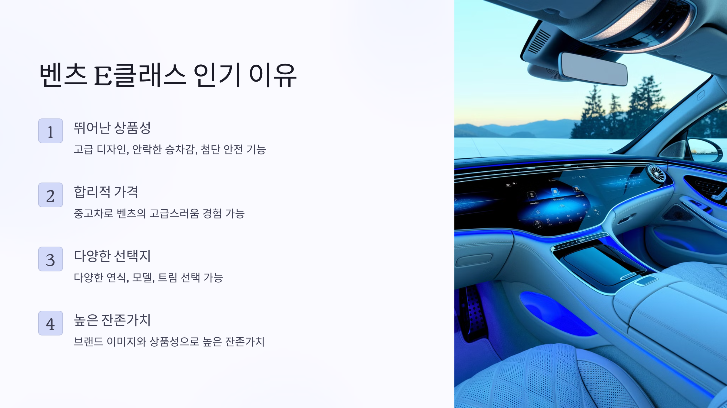 - 합리적인 가격: 신차 가격이 부담스러운 경우, 벤츠 E클래스 중고차는 상대적으로 저렴한 가격으로 벤츠의 고급스러움과 성능을 경험할 수 있는 좋은 기회입니다.